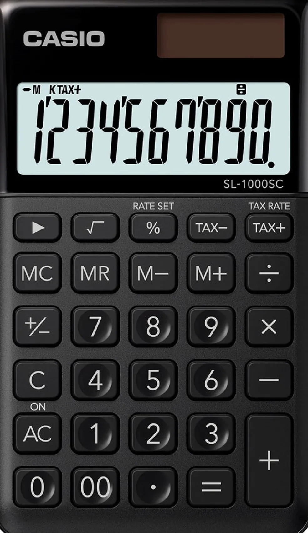 10-numeron iso näyttö Peruslaskutoimitukset Verolaskenta TAX+. TAX- Neliöjuuri √ Prosenttilaskenta % (mm. katelaskenta) Muisti MC, MR, M-,M+ Etumerkinvaihto +/- Tuhatlukuerotin Metallikuoret Kahden nollan 00- näppäin Lompakkokannet Virtalähde: valokenno/paristovarmennus (LR-1130). Pahvipakkaus