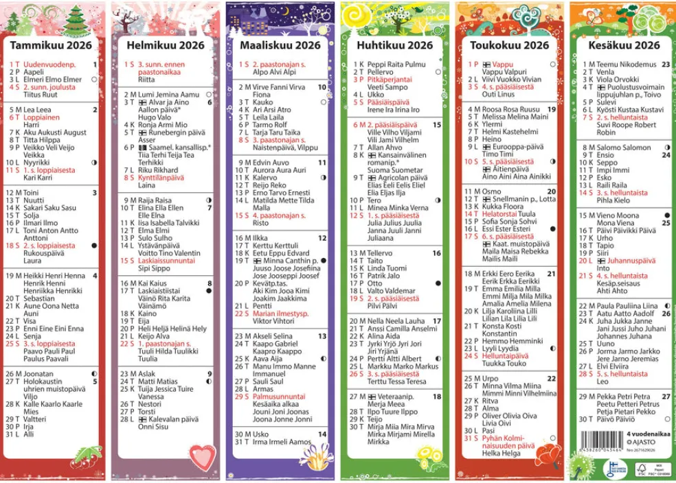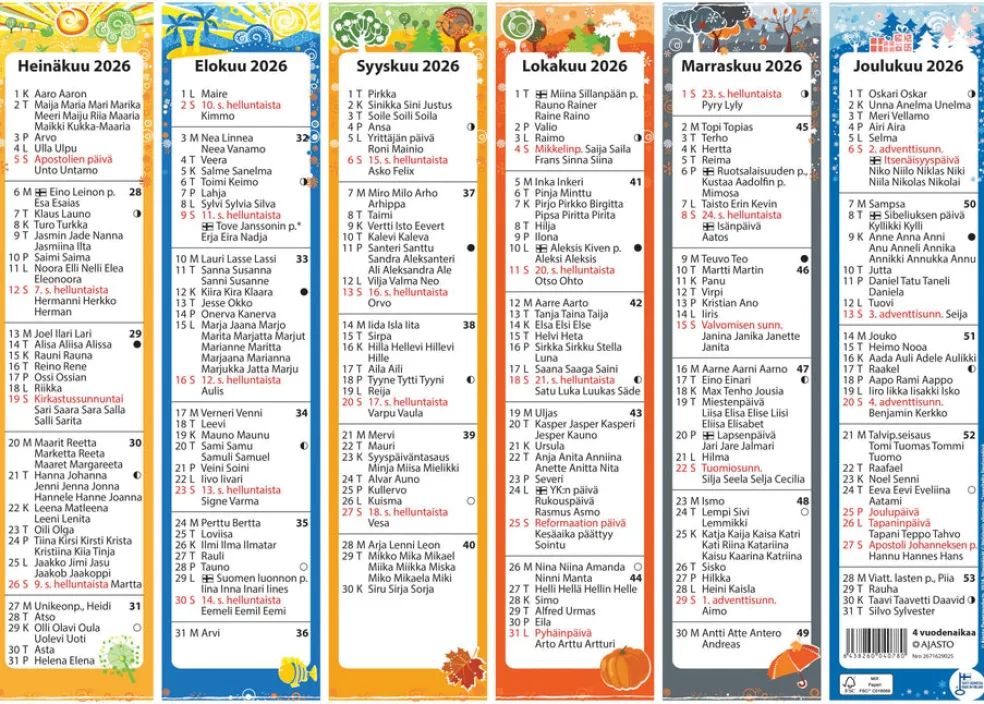 Koko 490 x 350 mm; kirkkopyhät ja juhlapäivät; runsaasti nimipäiviä; tukevaa kartonkia; Avainlippu-tuote; FSC®-sertifioitu tuote.