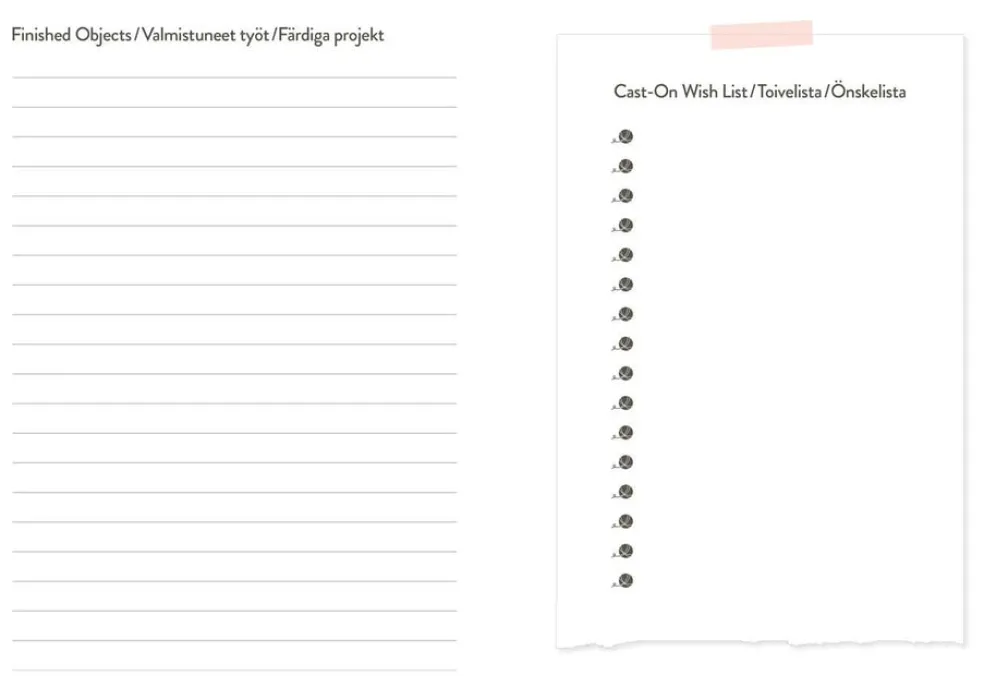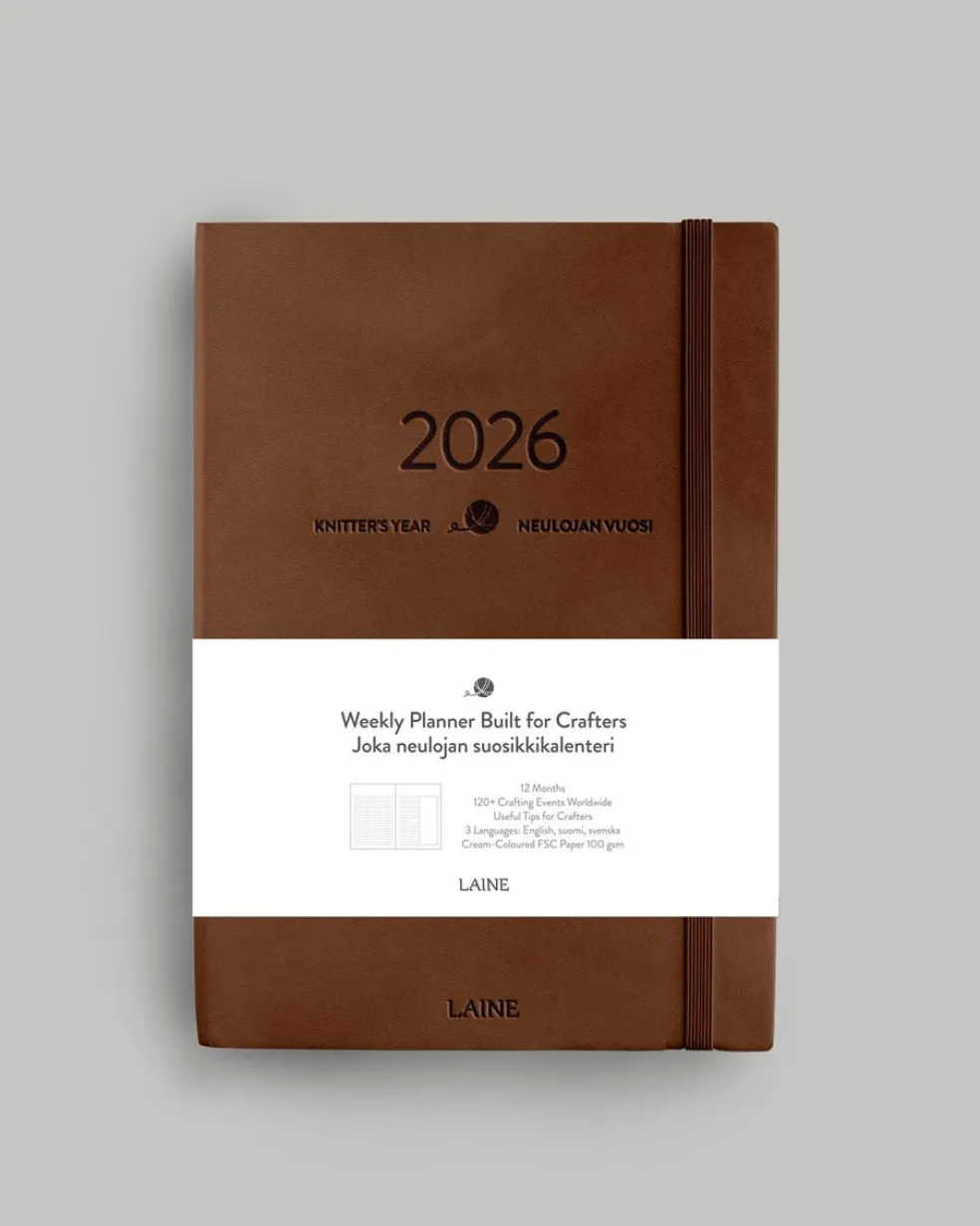 Lisäksi kalenteri sisältää muun muassa neulepuikkokokojen muuntotaulukon, eri lankavahvuuksien juoksevuudet, mittanauhan ja runsaasti tilaa omille muistiinpanoille.