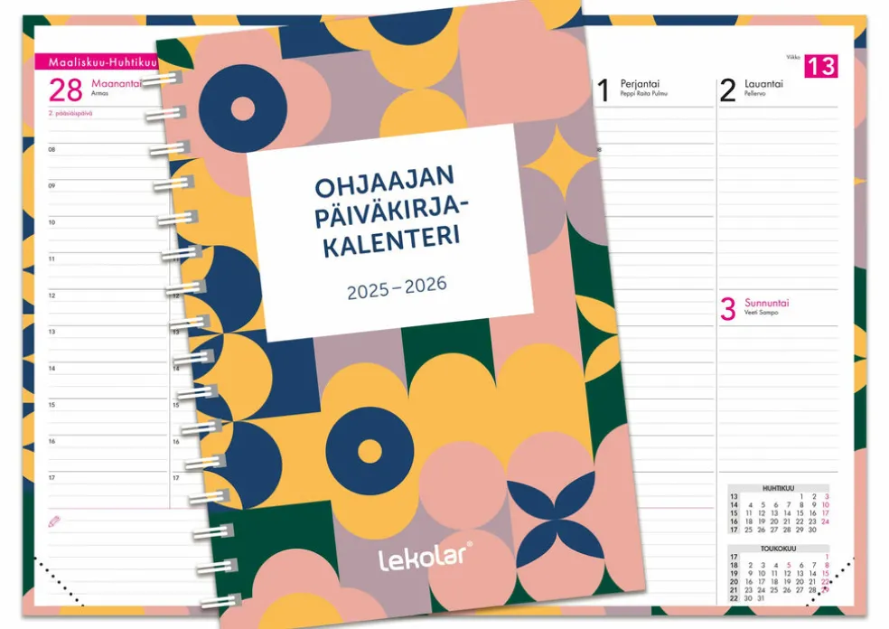 Koulunkäynninohjaajille sekä aamu- ja iltapäivätoiminnan ohjaajille. Suunniteltu yhteistyössä käyttäjien kanssa. Kalenteriosion lisäksi sisältää mm. ohjaajan omat työjärjestykset, luokan lukujärjestykset, luokan yhteystiedot, sivut kuljetusten hoitamiseen, viikoittaiset suunnittelusivut sekä runsaasti muistiinpanotilaa. Viikkoaukeama, lukuvuosijako. Takakannessa kätevä säilytystasku, kirjamerkkiläppä helpottaa tärkeän sivun löytämistä. Koko A5, 176 sivua, parikierresidottu. Ympäristöystävälliset, laminoidut kovapahvikannet.