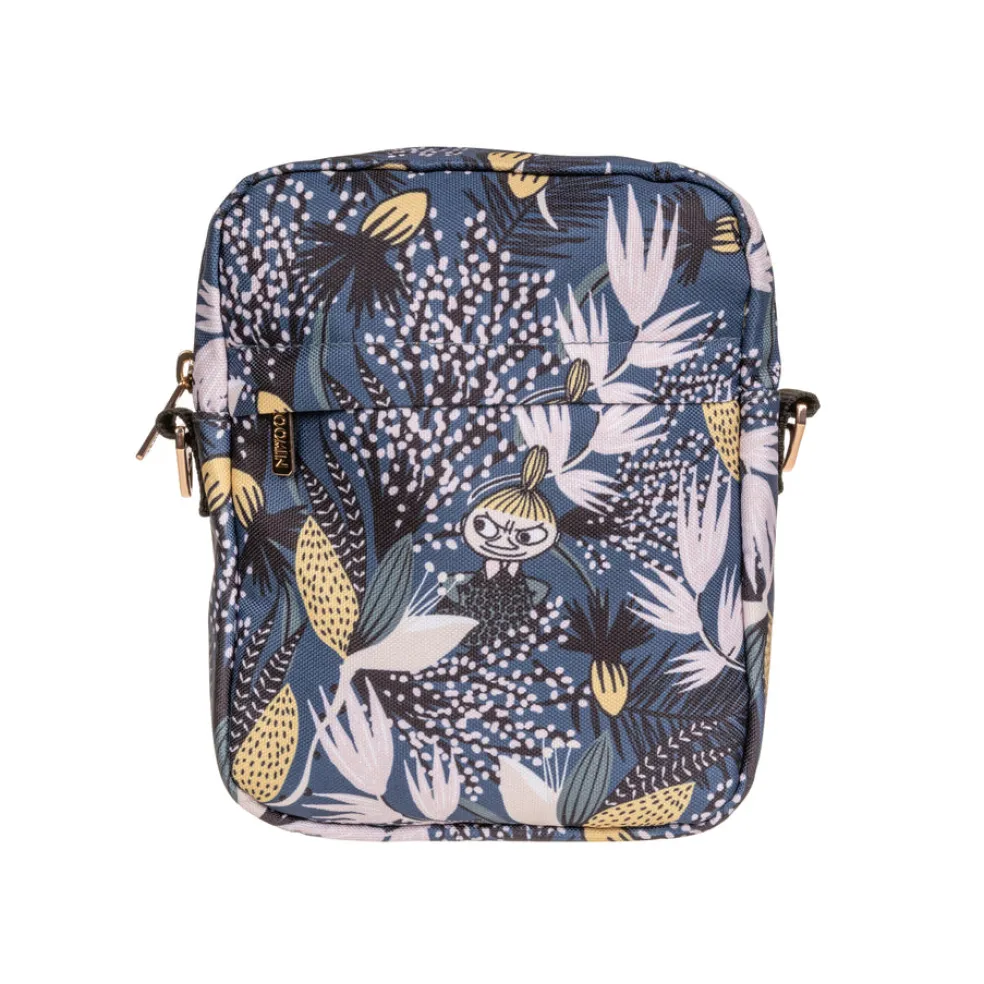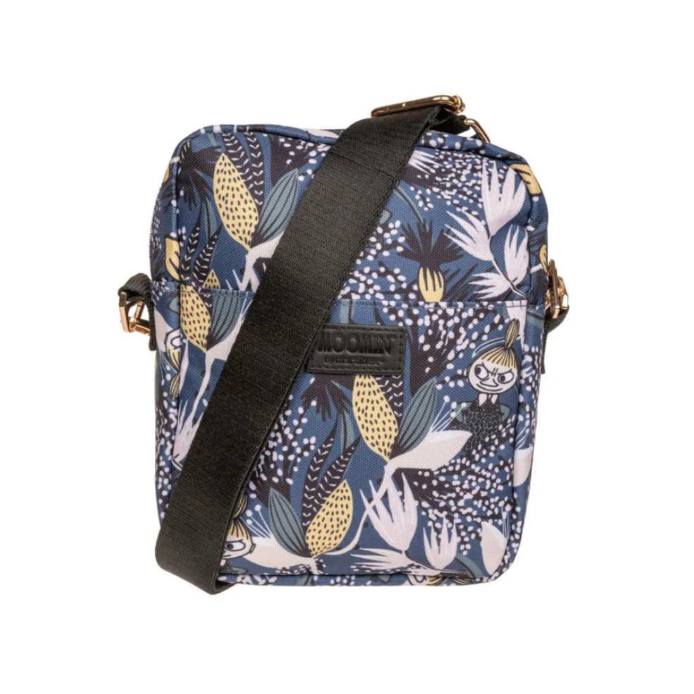 Kätevän kokoinen muumiaiheinen olkalaukku. Olkalaukussa on kaksi vetoketjulla suljettavaa osiota ja irrotettava, säädettävä olkahihna (130 cm). Valmistettu tukevasta polyesteristä.