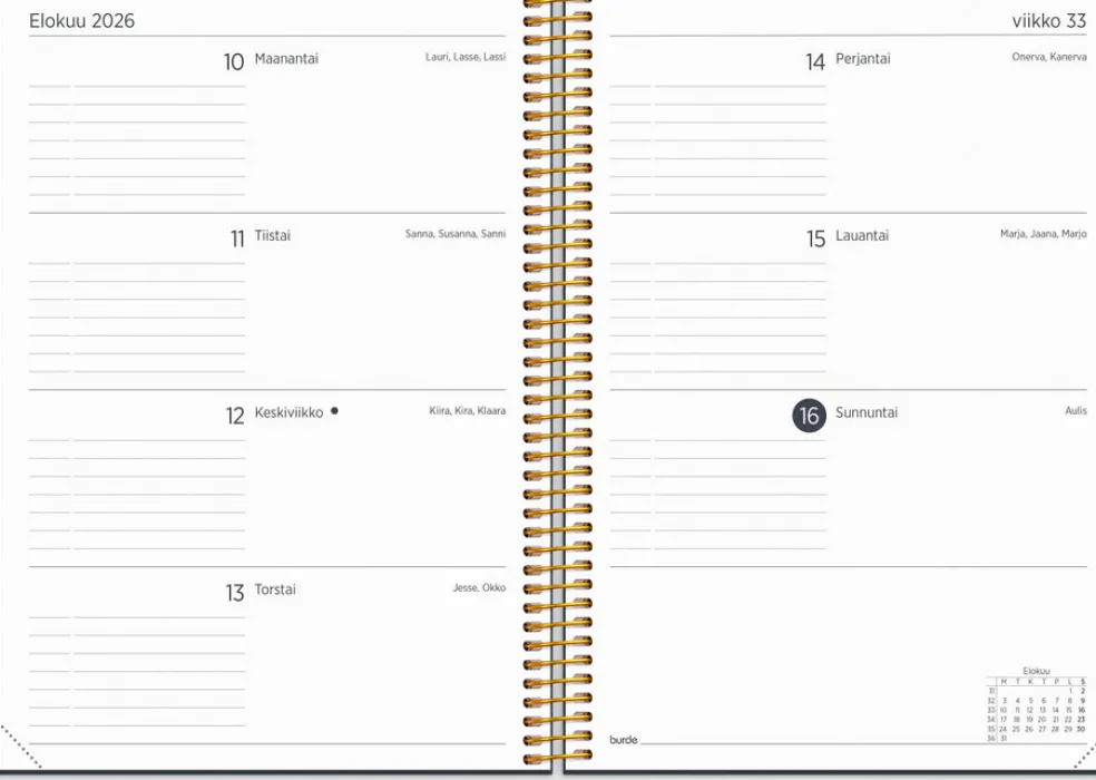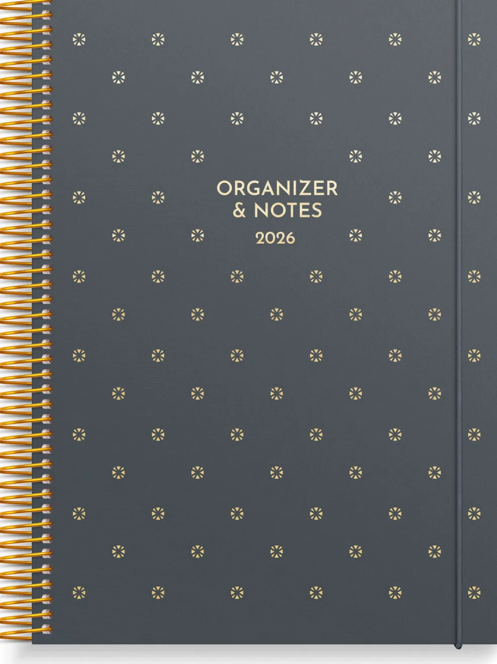 Kalenteri ja muistikirja yhdessä! Organizer & Notesin avulla saat runsaasti tilaa suunnitella jokaisen päivän. Ensimmäinen osa sisältää kalenterin, ja toinen osa sisältää rivilliset sivut luetteloillesi ja muistiinpanoillesi. Siirrettävien välilehtien avulla siirryt nopeasti ja sujuvasti viikkosuunnittelun ja muistiinpanojen välillä. Kun sinulla on kaikki yhdessä paikassa, stressi vähenee ja voit keskittyä muihin asioihin.Painettu kartonkikansi, kuminauhalla ja siirrettävillä kirjamerkeillä. Kalenterin aukeamalla yksi viikko ja kuluvan kuukauden kalenteritaulukko. Kalenteri sisältää nimipäivät, liputuspäivät, kuun vaiheet, vuosiruudukot kuluvalle ja seuraavalle vuodelle, vuosisuunnitelmat kuluvalle ja seuraavalle vuodelle sekä paljon muistiinpanosivuja. Kalenteriosa: vk 50 2025-vk 53 2026/2027. Suomenkielinen. Kierresidottu. FSC®. Koko: 148×210 mm (A5).
