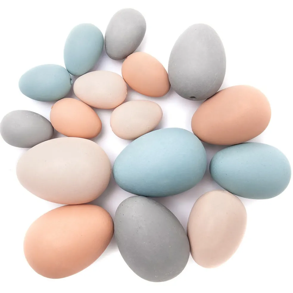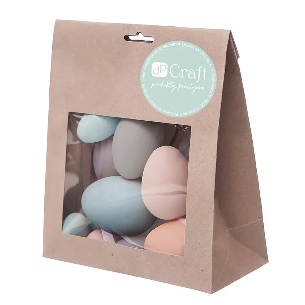Eri kokoisia ja värisiä muovimunia pakattuna ruskeaan ikkunalliseen paperipussiin