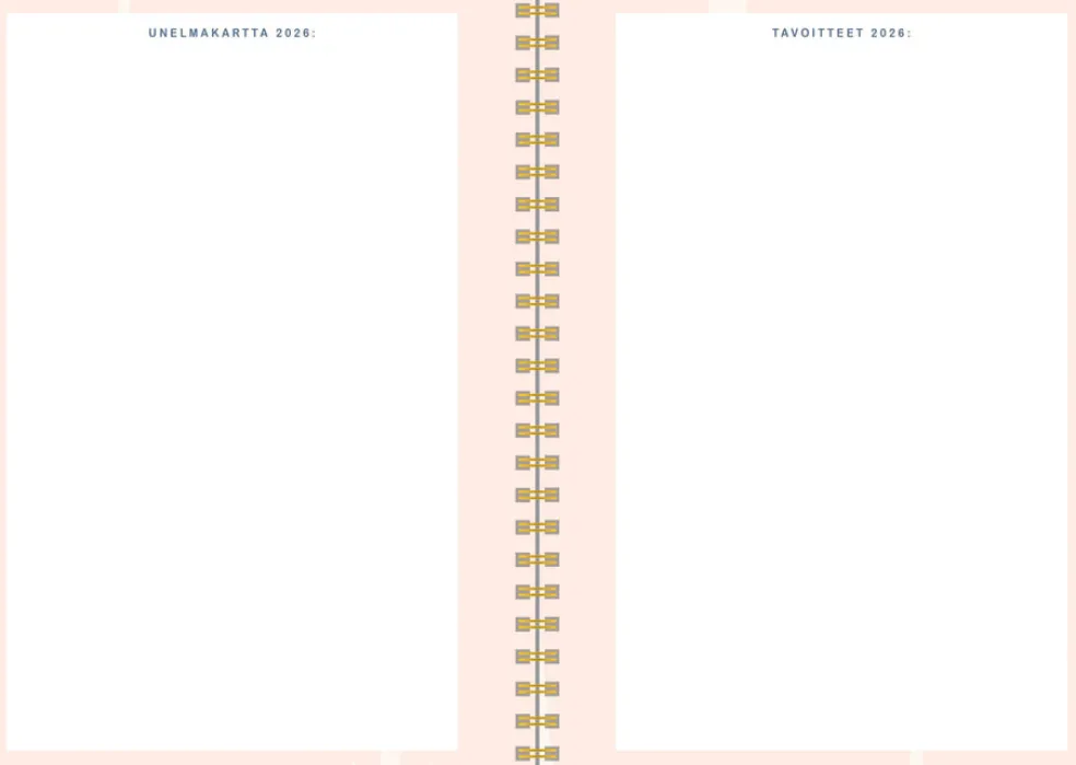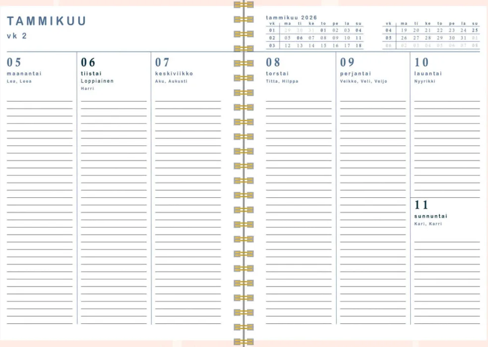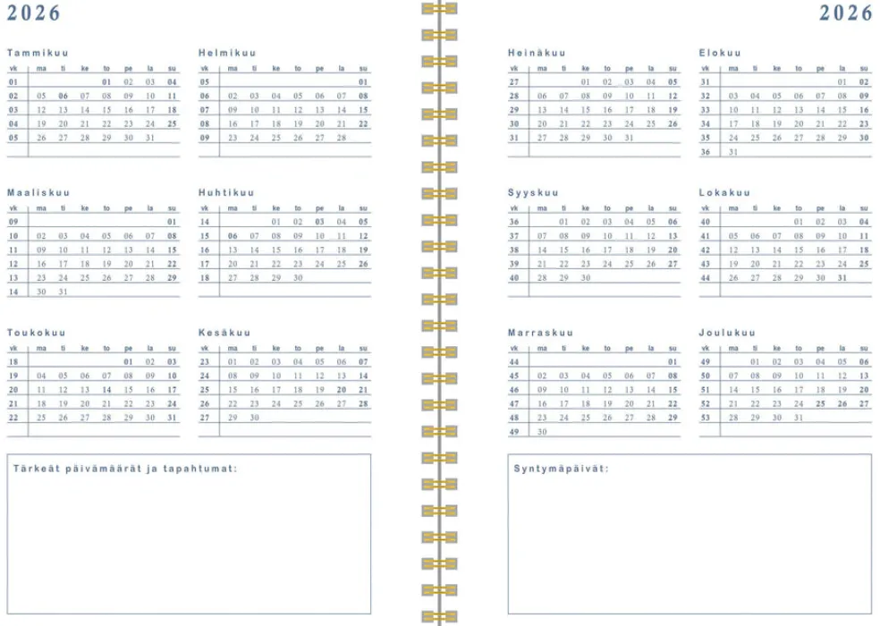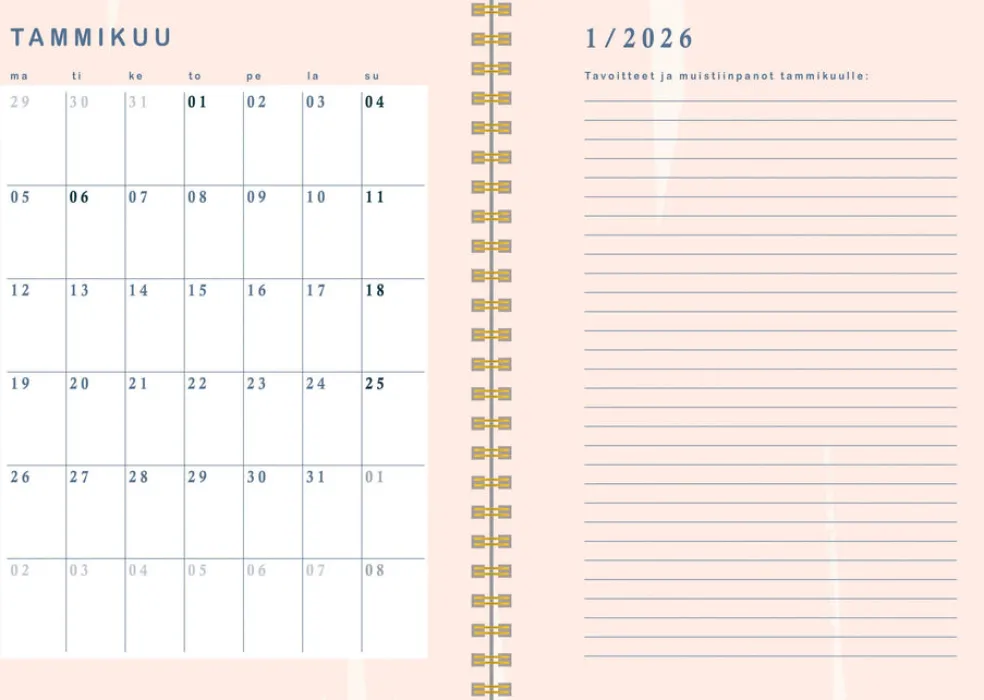 Koko 148 x 210 mm (A5); parikierresidottu; kartonkikannet; aukeamalla selkeä viikkonäkymä; päiväkirja 1/2026 – 1/2027; liputuspäivät Suomessa; suomalaiset nimipäivät; runsaasti muistiinpanotilaa; joka kuukauden alussa tilaa tärkeille päivämäärille ja tavoitteille; FSC®-sertifioitu tuote.