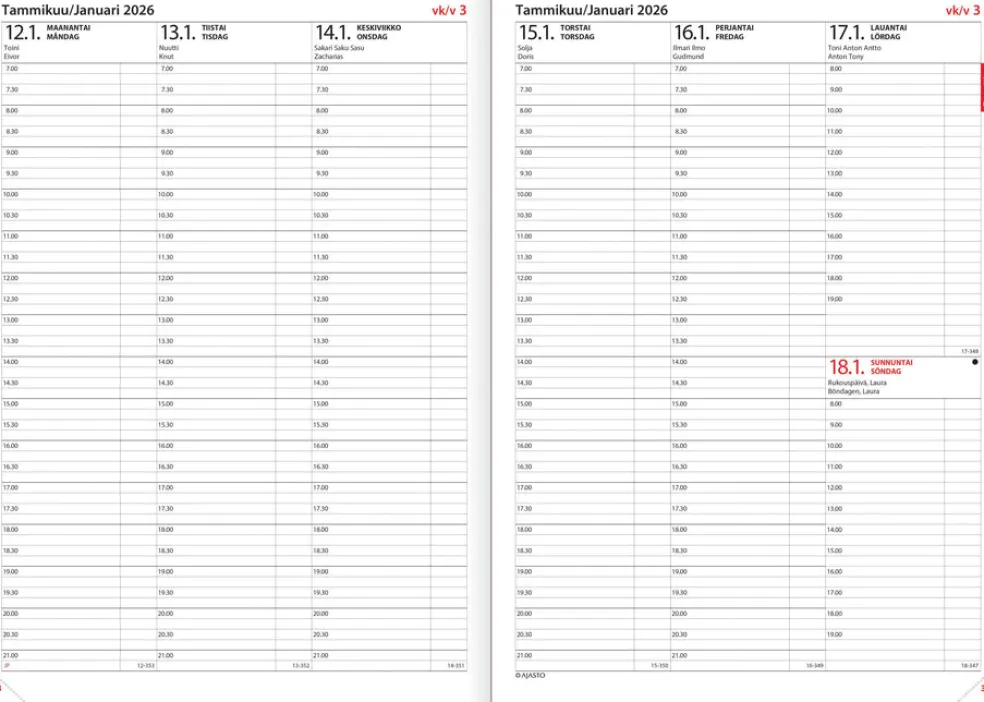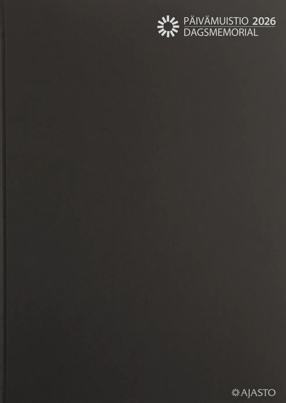 Koko 210 x 297 mm (A4); sidottu; kielisyys: suomi, ruotsi; päiväkirja 49/2025–1/2027; vuosisuunnitelmat 2026–2028; kansalliset vapaapäivät päiväkirjan sivuilla ja luettelona; taulukkoalmanakka vuosille 2027–2032 ja luettelo näiden vuosien tärkeistä päivistä; suomalaiset ja suomenruotsalaiset nimipäivät; takana esiintaitettava vuoden 2026 taulukkokalenteri; Suomen kartta; FSC®-sertifioitu tuote.