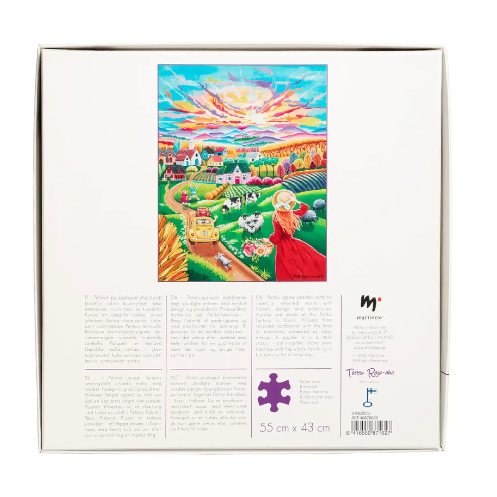 Upean värikäs ja yksityiskohtainen 750 palan palapeli. Kuvan on luonut suomalainen taiteilija Terttu Raja-Aho. Palapeli on kestävä klassikko vailla vertaa – yksin koottavaksi, koko perheen ajanvietteeksi, sadepäivän ratoksi. Valmiin palapelin koko on 55 x 43 cm. Valmistettu Suomessa kierrätyskartongista.