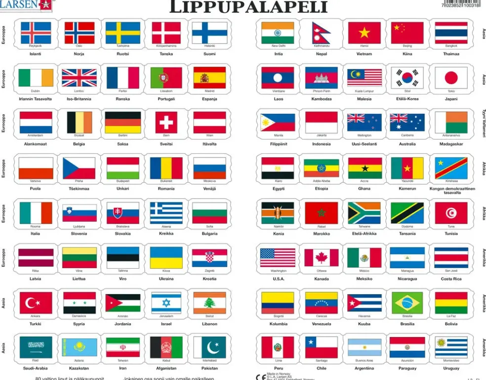 Maxi 36,5 x 28,5 cm. Palapelissä on 80 palaa. Norjalainen Larsen on valmistanut palapelejä omassa tehtaassaan Norjassa jo vuodesta 1953 lähtien. Larsenilla kantava ajatus on aina ollut tuottaa laadukkaita tuotteita lapsille, jotka ovat samalla hauskoja pelata ja opettavaisia. Ikäsuositus: 3+ v.