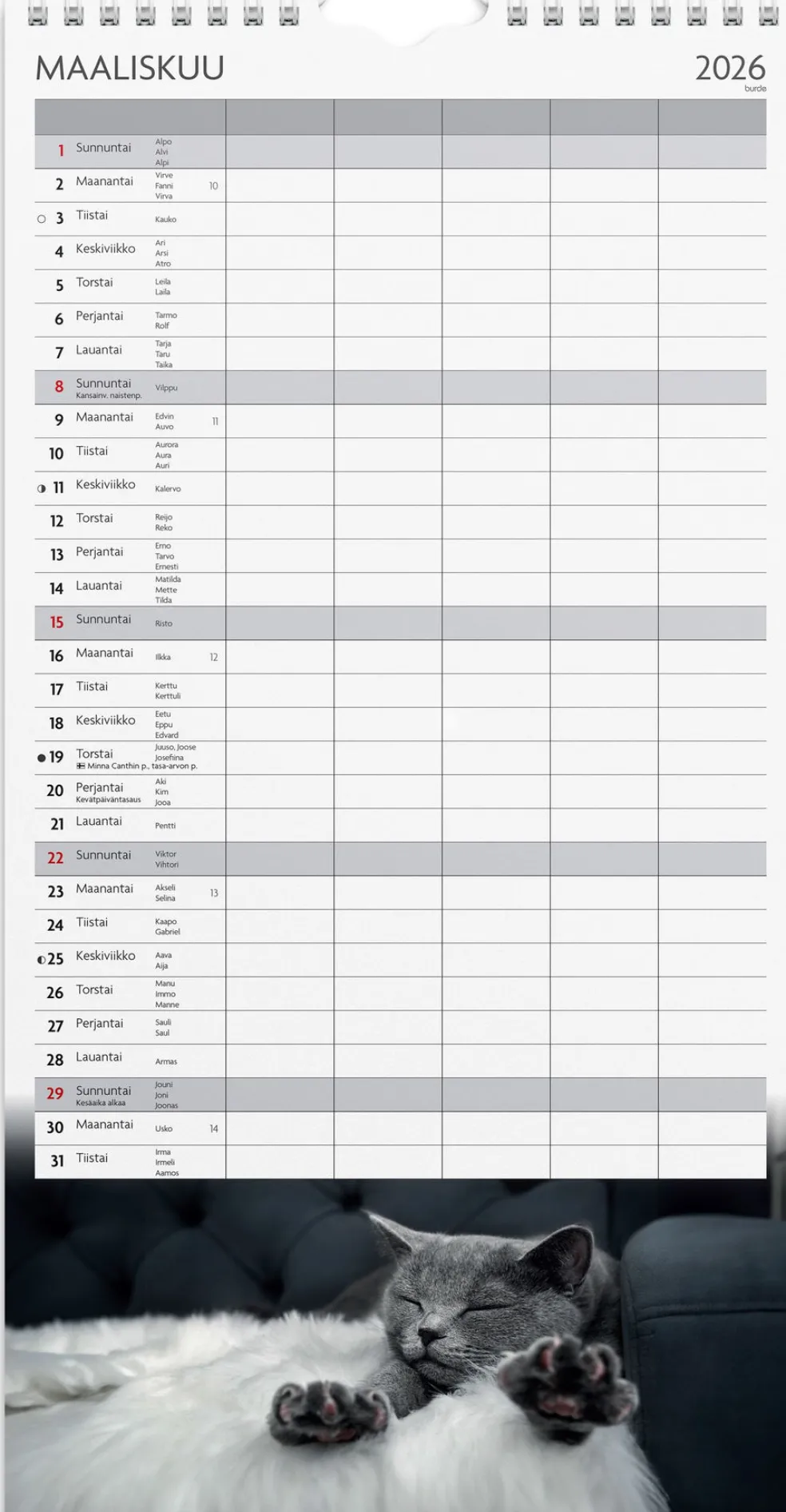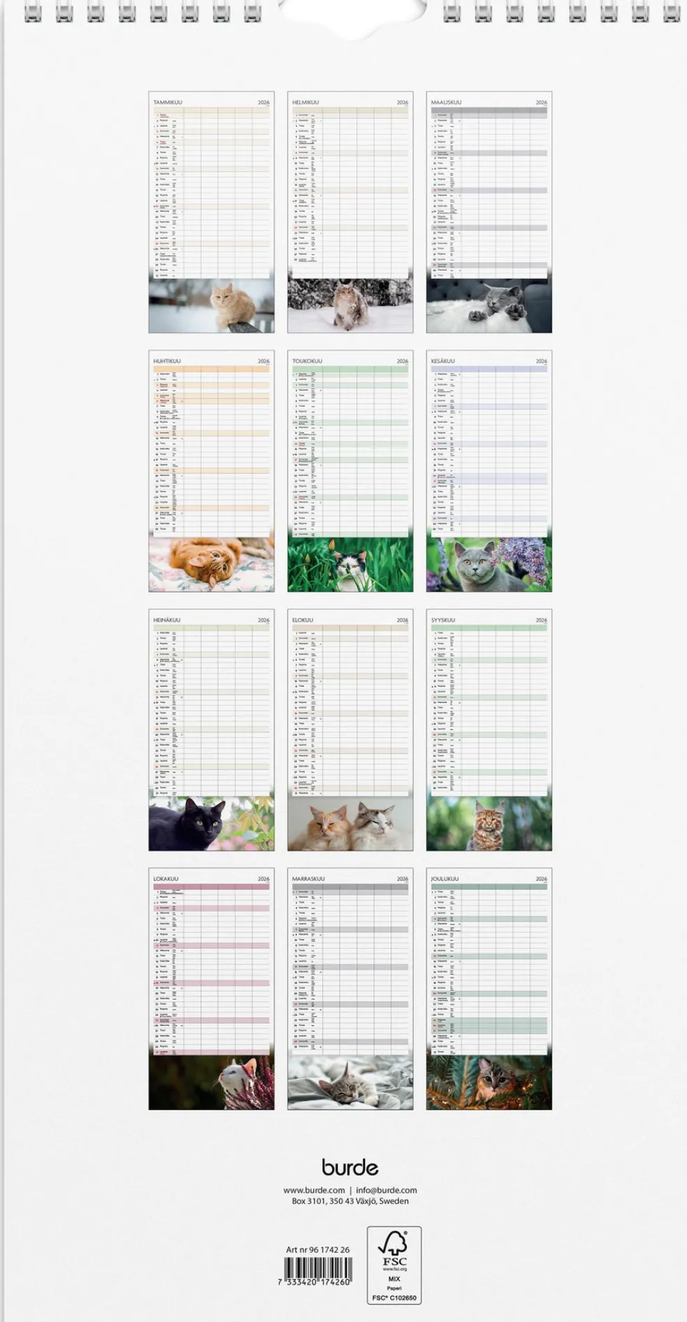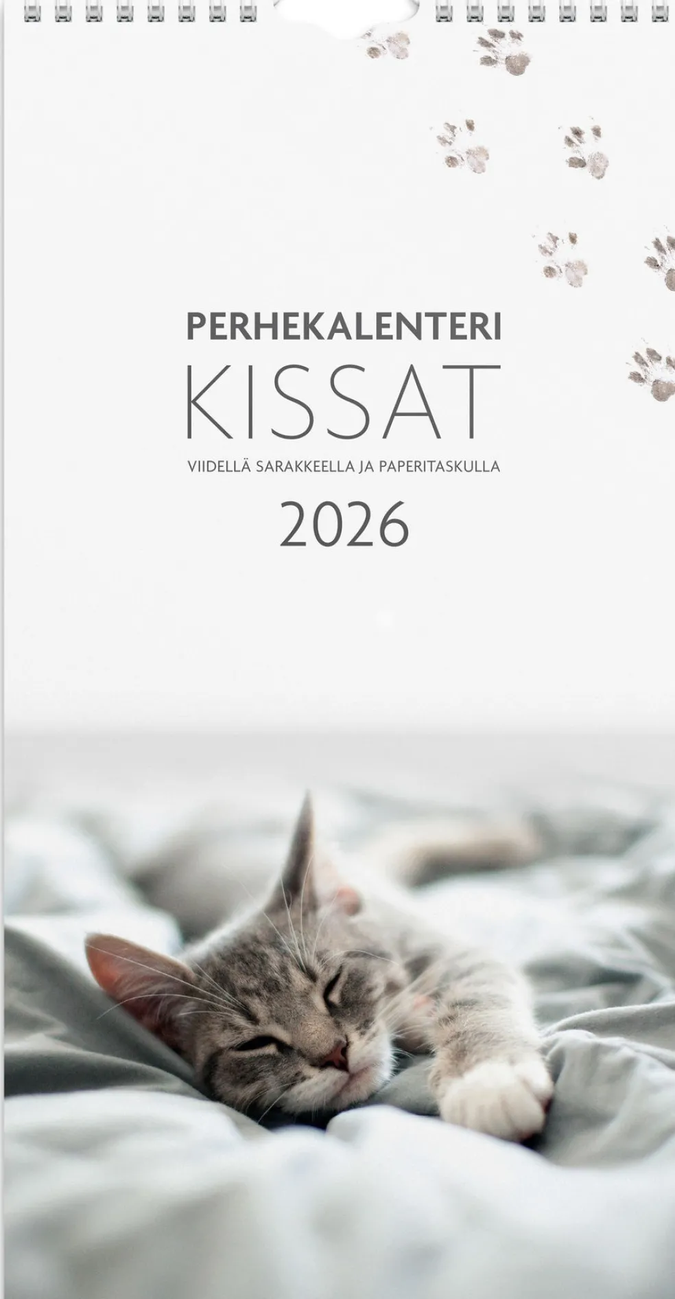 Perhekalenteri paperitaskulla, jossa on viisi saraketta perhesuunnittelua varten. Hienot kissakuvat joka aukeamalla. Kalenteri sisältää nimipäivät, liputuspäivät, juhlapyhät ja kuun vaiheet. Suomenkielinen. Parikierresidottu. FSC®. Koko: 220×430 mm.