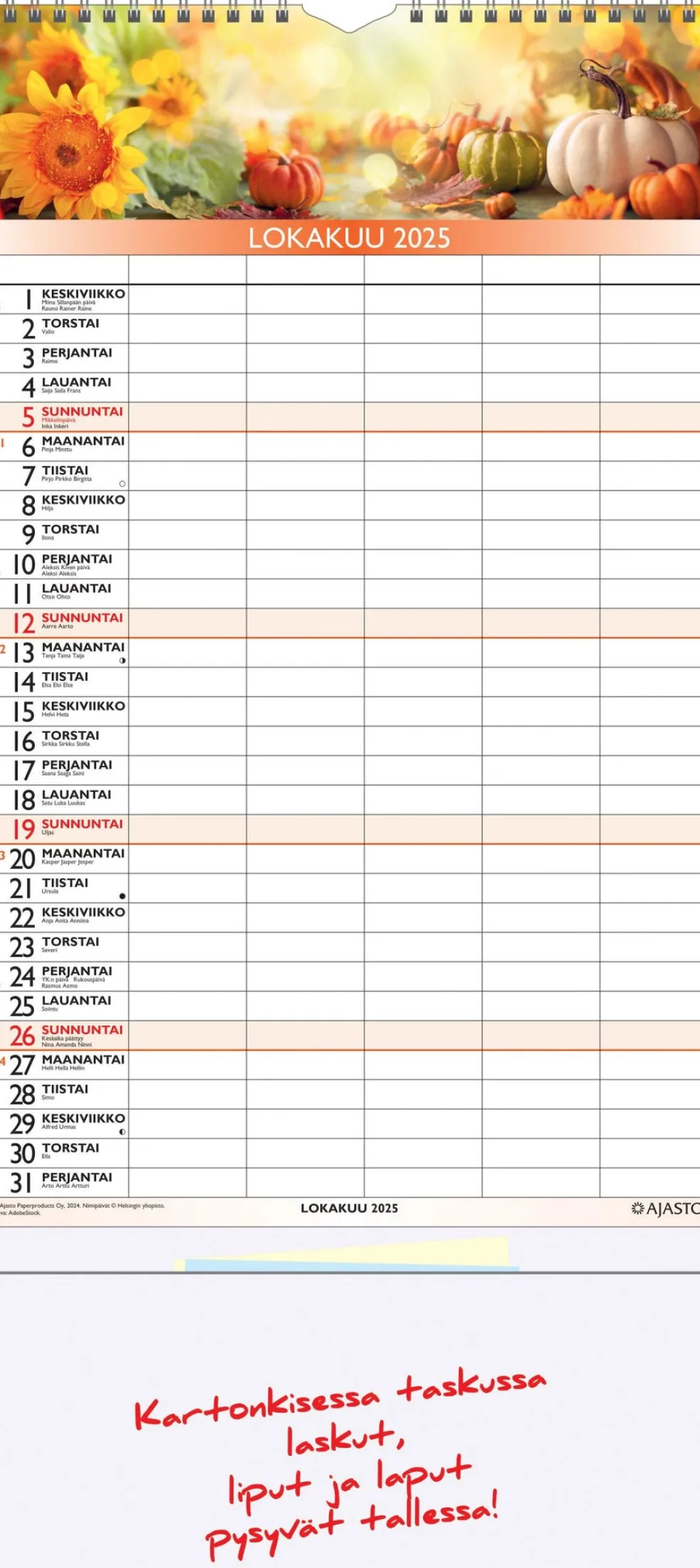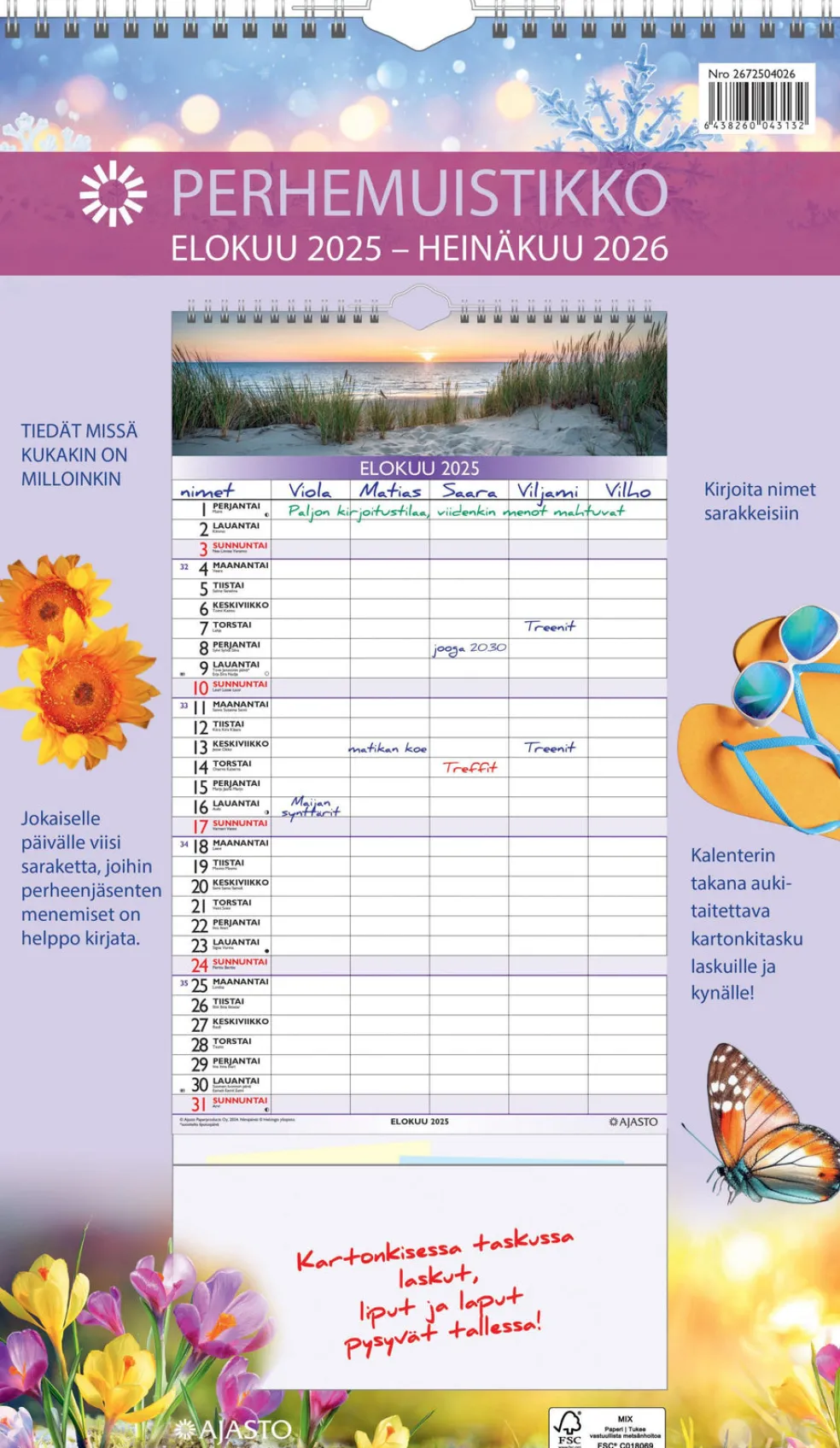 Koko 250 x 415 mm, parikierresidottu, jokaiselle päivälle viisi saraketta, joihin perheenjäsenten menemiset on helppo kirjata, aukeamalla kuukausi 8/2025-7/2026, suomalaiset nimi- ja juhlapäivät, takana kätevä muovitasku laskuille ja kynälle, FSC®-sertifioitu tuote.