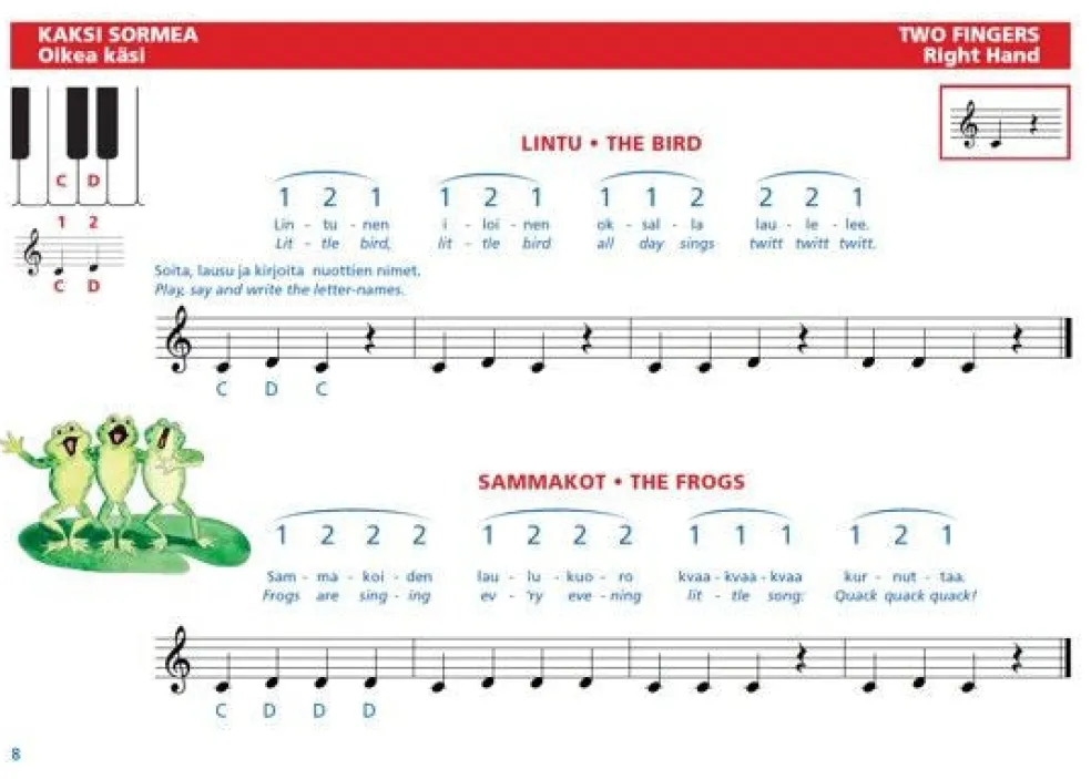 The Piano Key ABC Book is a fun, bilingual (Finnish & English) introduction to any piano method. With a wide variety of original performance pieces for one, two and three players, this primer develops a beginner’s playing and reading skills within the span of two octaves.