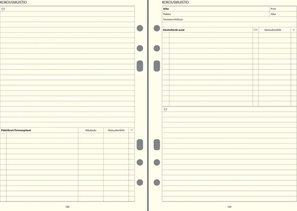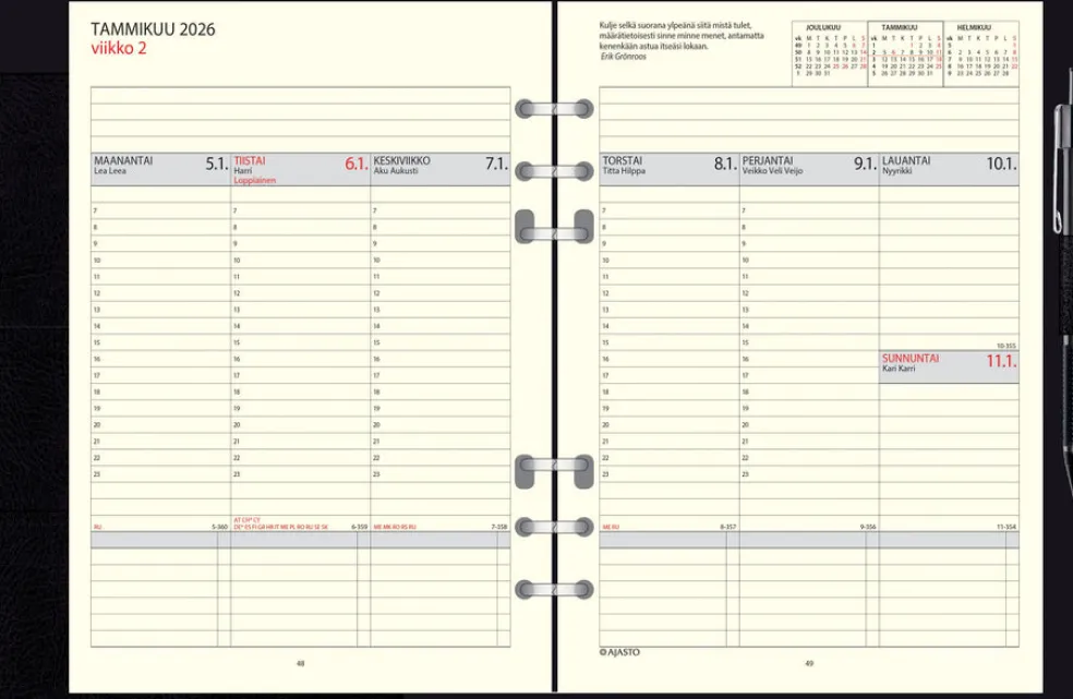 Koko 148 x 210 mm (A5); leatherette-kannet; kuusirenkainen mekanismi; aukeamalla viikkonäkymä; päiväkirja 45/2025–1/2027; vuosisuunnitelmat 2026 ja 2027; suomalaiset nimipäivät; kansalliset vapaapäivät; puhelin-, asiakas-, päivä- ja kokousmuistiosivut; lyijytäytekynä ja kynänpidike; runsaasti muistiinpanotilaa; FSC®-sertifioitu tuote.