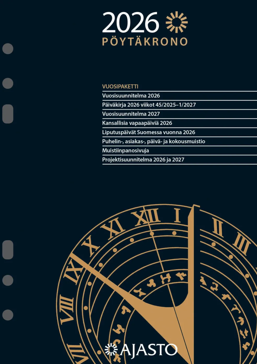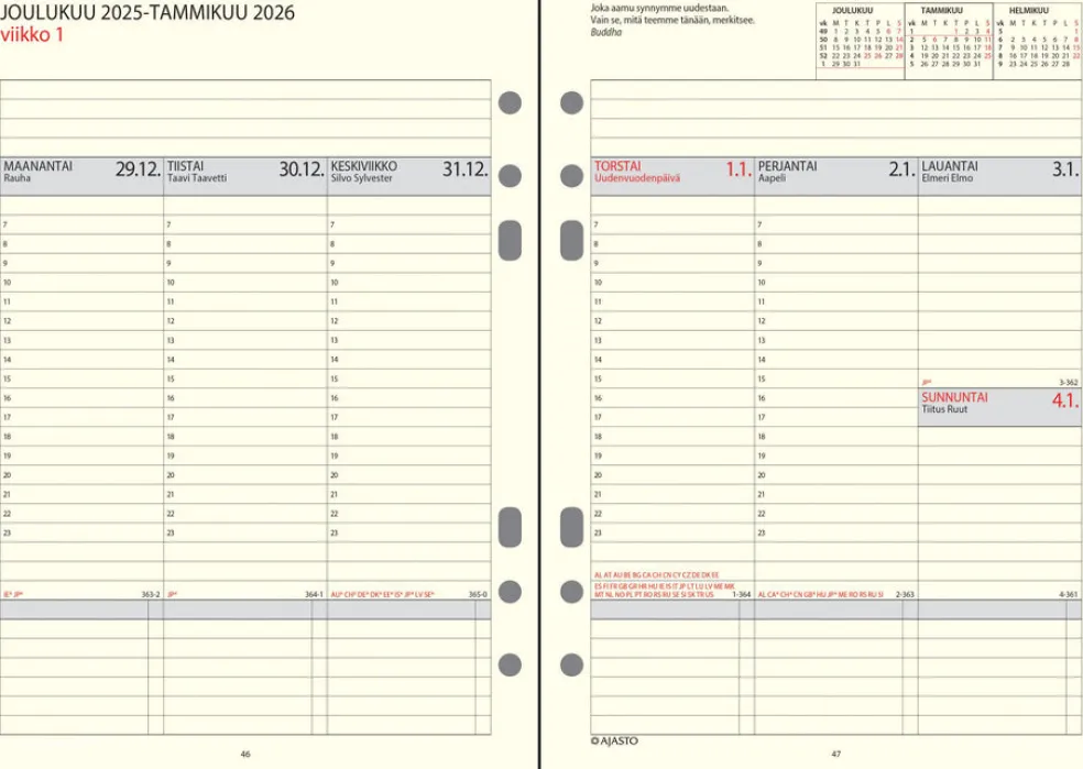 Koko 148 x 210 mm (A5); kuusirenkaisen mekanismin reiät; aukeamalla viikkonäkymä; päiväkirja 45/2025 – 1/2027; vuosisuunnitelmat 2026 ja 2027; suomalaiset nimipäivät; kansalliset vapaapäivät; puhelin-, asiakas-, päivä- ja kokousmuistiosivut; runsaasti muistiinpanotilaa; sopii myös Project365- ja Timex Space kansiin; FSC®-sertifioitu tuote.
