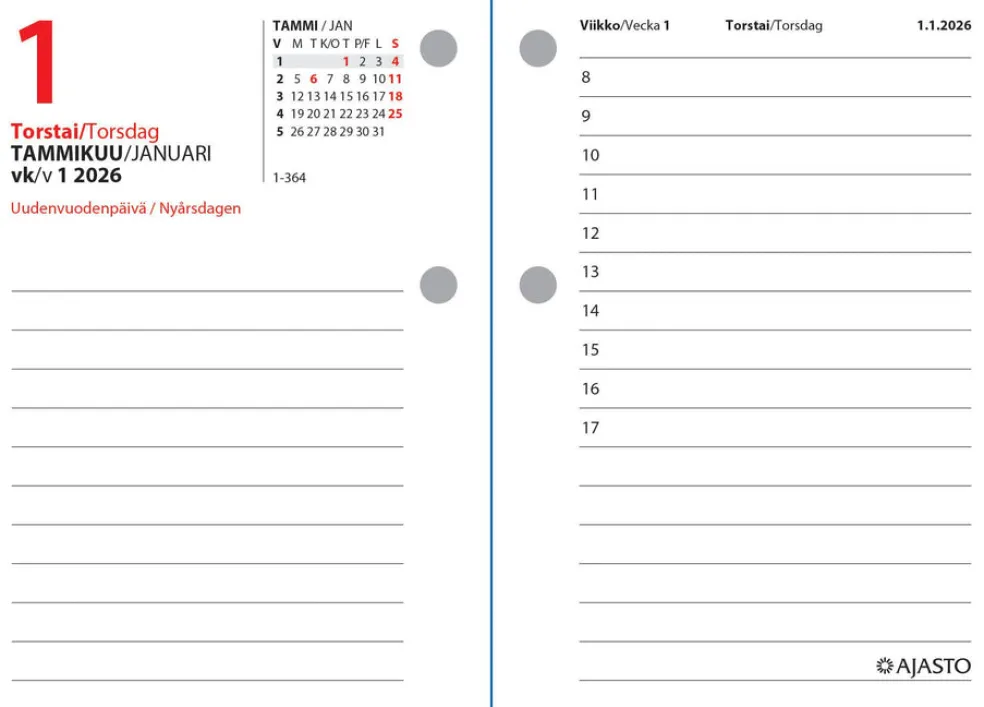 Koko 83 x 119 mm; erillisellä alustalla pidettävä kalenterilehtiö; kielisyys: suomi, ruotsi; suomalaiset ja suomenruotsalaiset nimipäivät; FSC®-sertifioitu tuote.