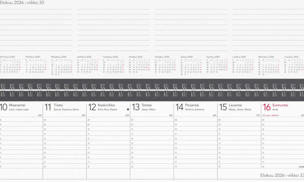 Kierrätyskartonkikannet. Kalenterin aukeamalla yksi viikko, tuntijaotus 08-18 ja koko vuoden kuukausitaulukot. Kalenteri sisältää nimipäivät, kansalliset pyhäpäivät, liputuspäivät, kuun vaiheet, vuosiruudukot kuluvalle ja seuraavalle vuodelle.Kalenteriosa: vk 52 2025-vk 53 2026/2027. Suomenkielinen. Parikierresidottu. FSC®. Koko: 305×90 mm.
