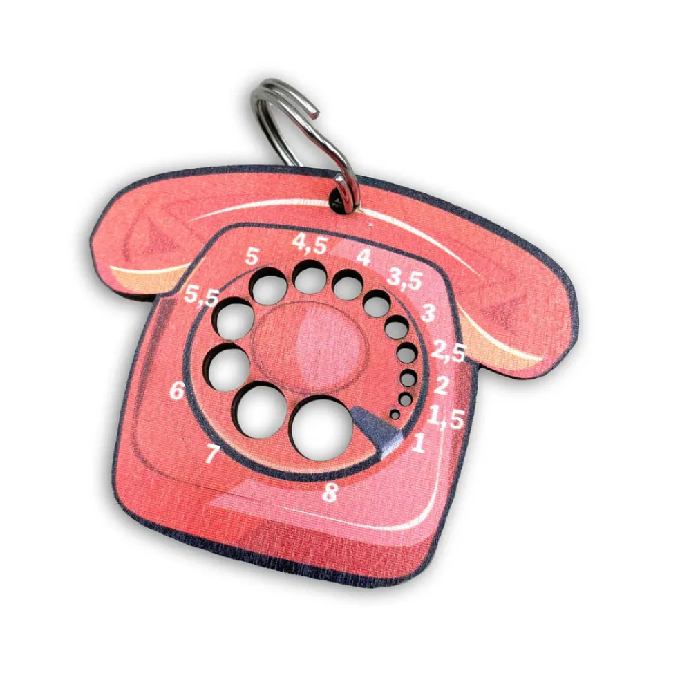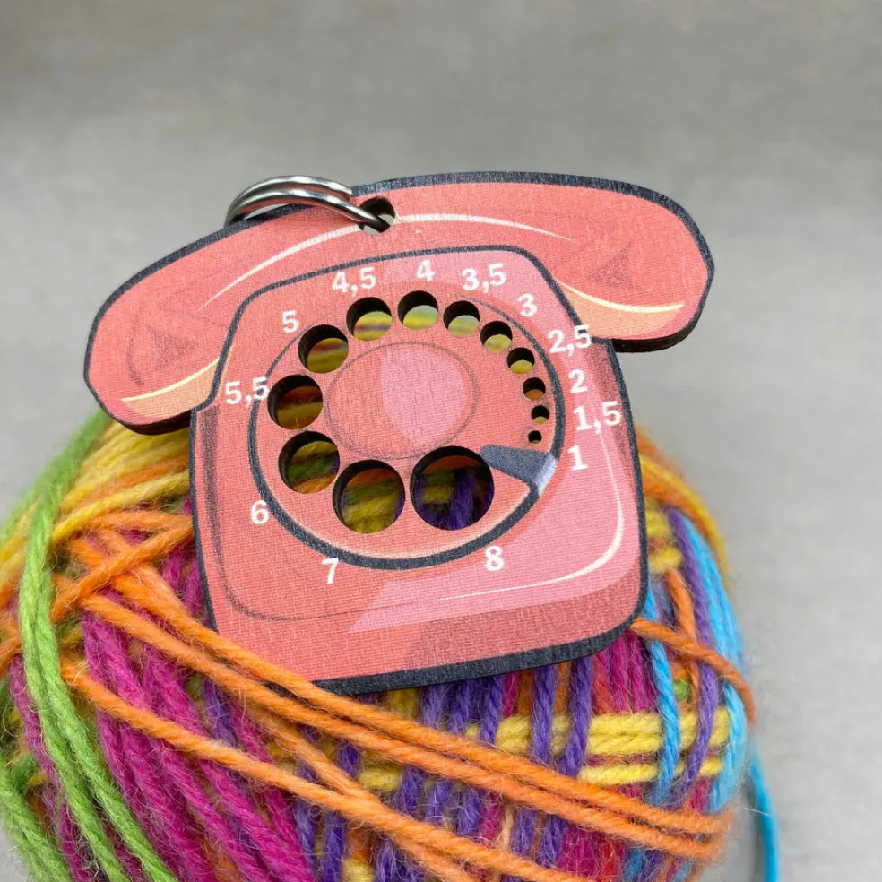 Perinteisen puhelimen näköinen puikkomitta sisältää mitat 2 mm – 10 mm puikoille ja kulkee näppärästi neulojan mukana. Kuva on UV-tulostettu vanerin pinnalle ja se kestää erittäin hyvin kulutusta.