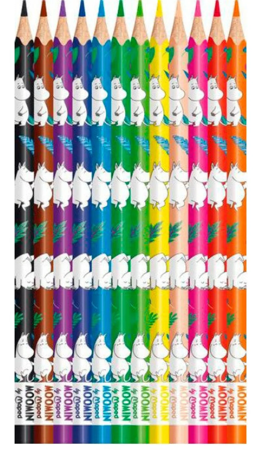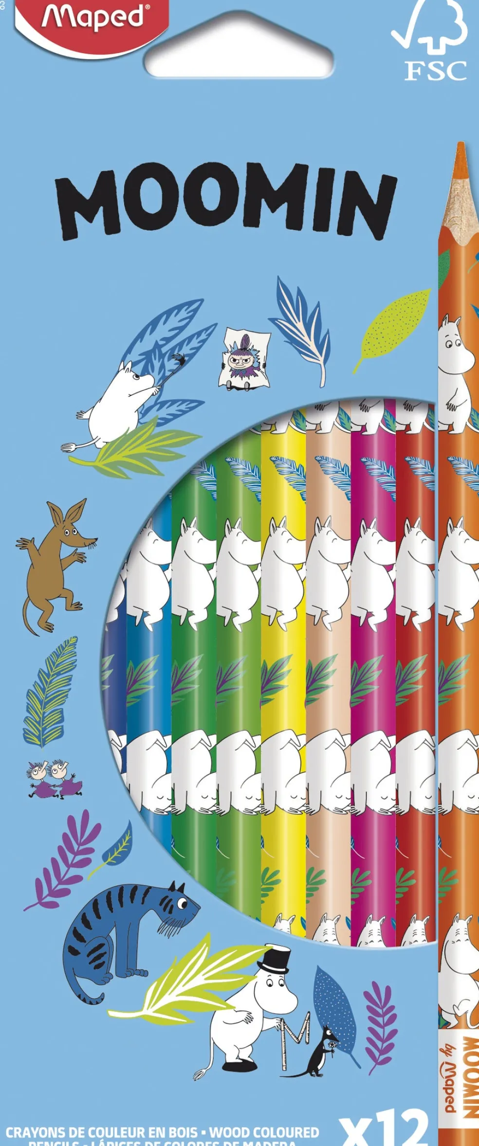 Muumi-värikynät FSC-sertifioidusta puusta. Kolmiomuoto takaa helpon ja mukavan otteen kynästä. Kynissä on kestävät kärjet ja ne ovat helpot teroittaa. Kynät ovat koristeltu ihastuttavilla Muumi-hahmoilla.