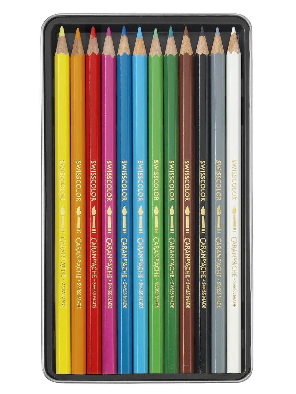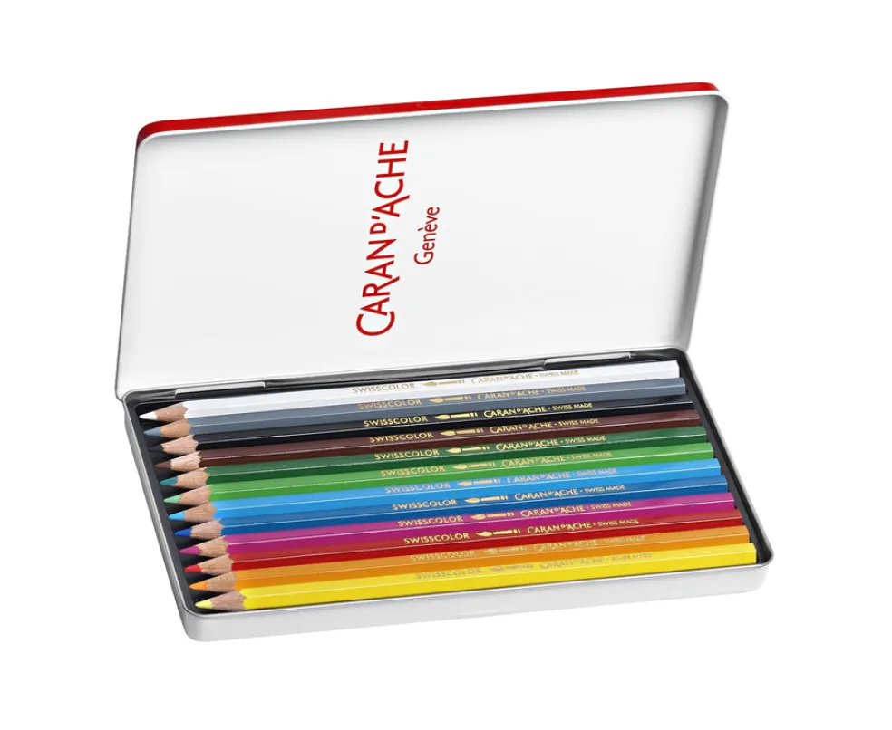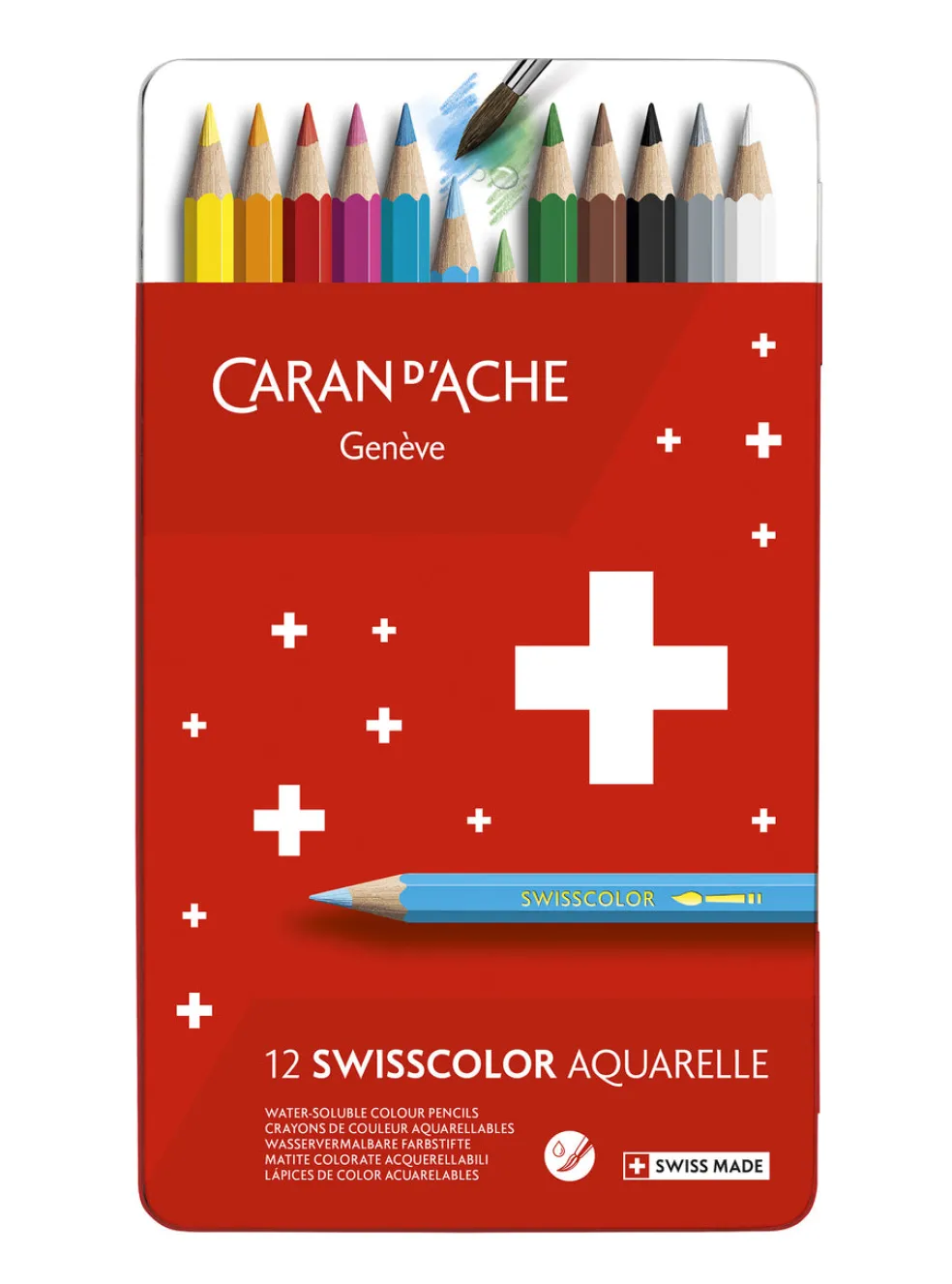 Caran d’Achen Swisscolor akvarellikynät 12 värin lajitelmana. Kirkkaat ja voimakaspigmenttiset sävyt. Kynät on nimensä mukaisesti valmistettu Sveitsissä vastuullisesti käyttäen FSC-sertifioitua seetripuuta, sekä hyvän valonkeston omaavia pigmenttejä. Kynissä on korkea pigmenttipitoisuus ja ne ovat sangen kestäviä. Akvarellikyniä voi käyttää joko veden kanssa tai ilman. Värisydän on 2.8 mm paksuinen mahdollistaen näin tarkankin piirtämisen. Kestävä metallirasia, 12 väriä.