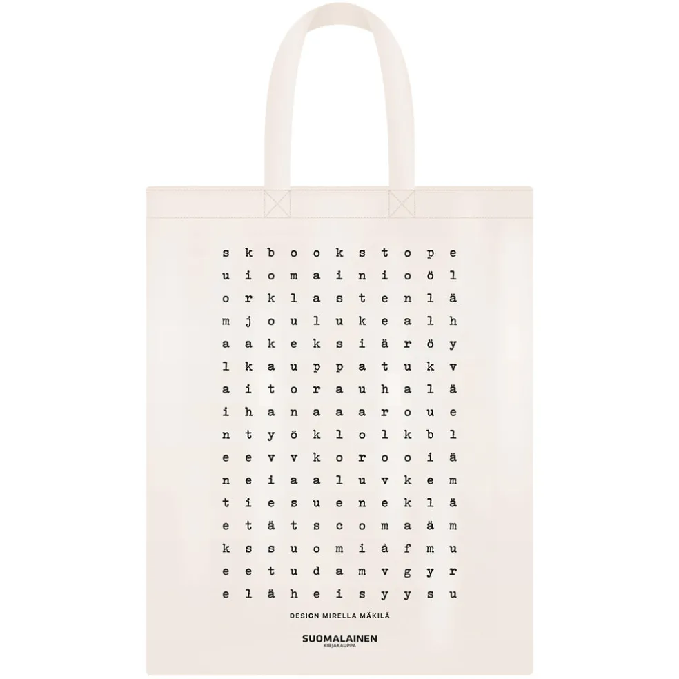 Omat sanat luomupuuvillakassin on suunnitellut työkseen kirjojen kansia suunnitteleva kirjagraafikko Mirella Mäkilä. Kassissa on piilosanojen tyyliin kirjaimia, joista muodostuu kymmeniä eri sanoja. Jokainen voi itse bongata sanoja ja itselle tärkeät sanat voi nostaa esiinkin, esimerkiksi ympäröimällä tekstiilitussilla. Omat sanat ja vapaus sanoa ovat tärkeitä meille kaikille. Mikä sana on sinulle tärkeä? Montako sanaa löydät?