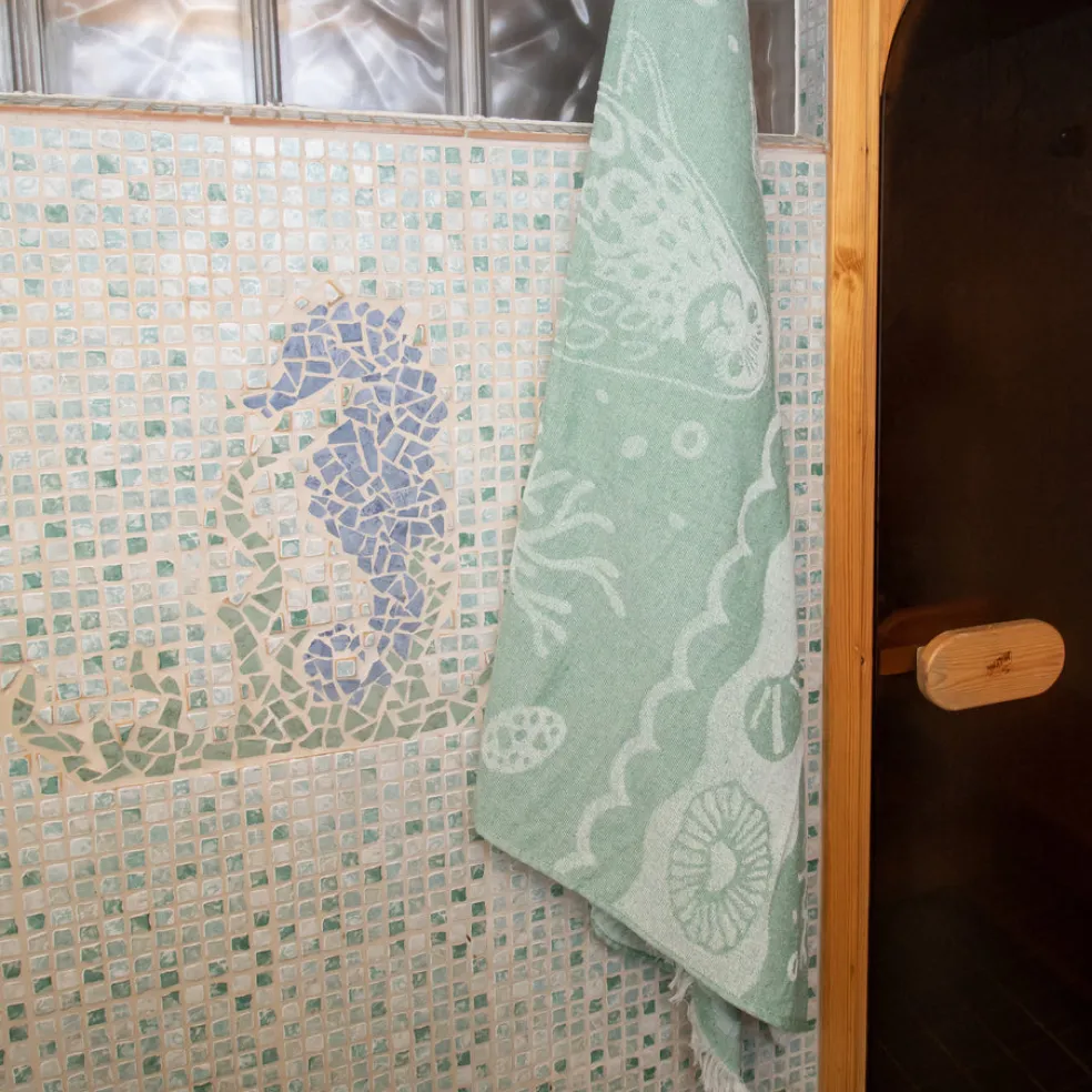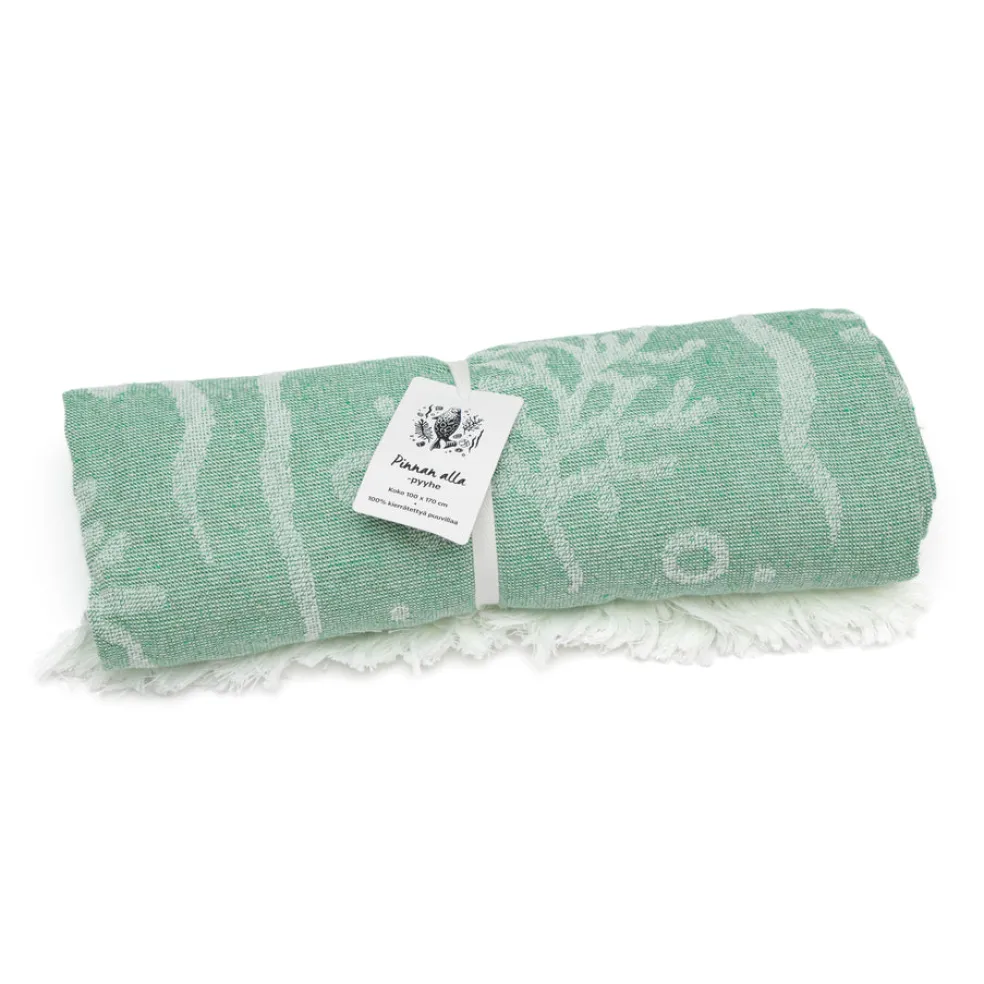 Pinnan alla -pyyhe on kevyt, mutta silti imukykyinen ja pehmeä. Se soveltuu erinomaisesti niin rannalle, piknikille, kylpylään tai kesämökin saunaan.