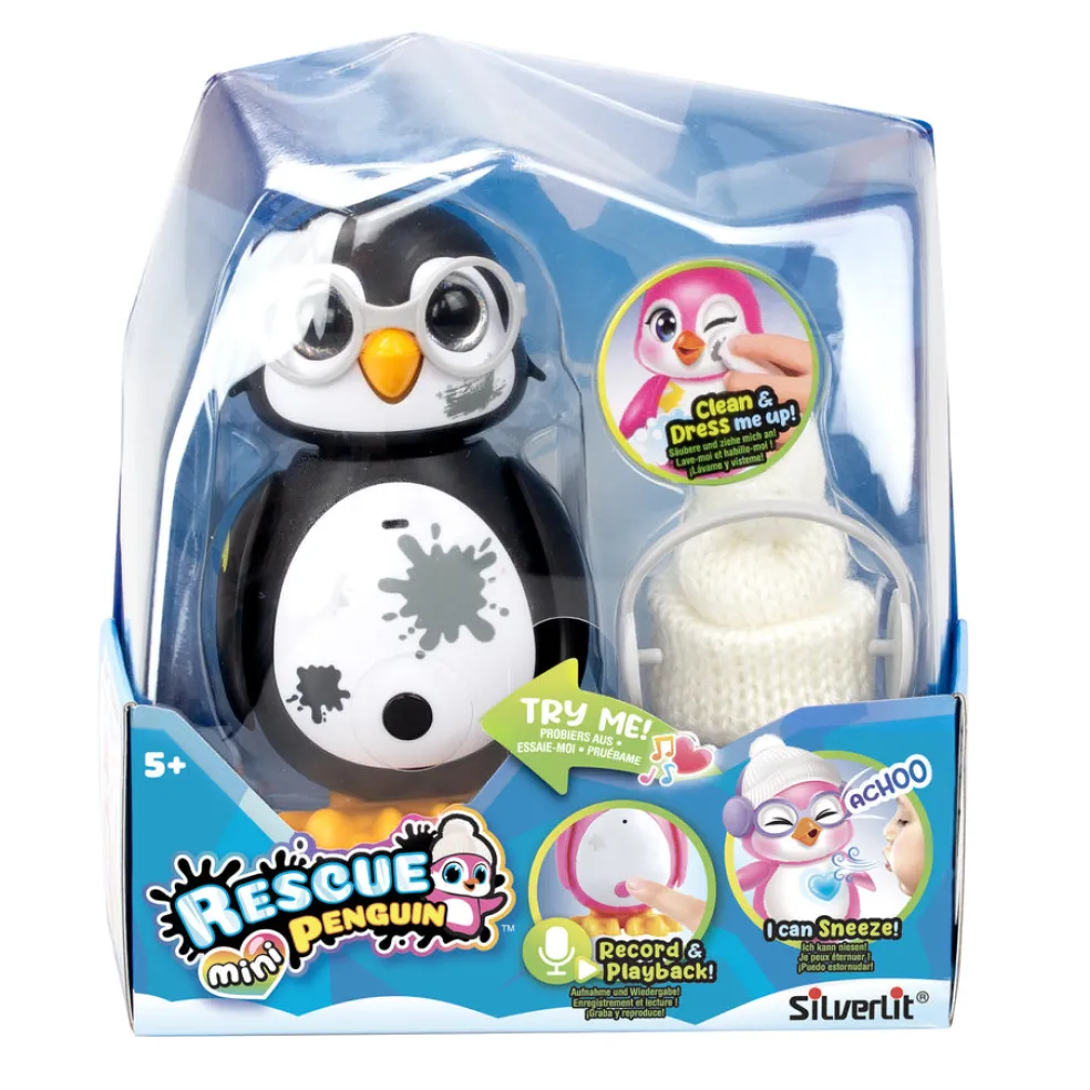 Rescue Penguin Mini on elektroninen interaktiivinen lemmikki. Puhdista, pue, ruoki ja hoivaa omaa pientä pingviiniä ja näet sen ainutlaatuiset ominaisuudet. Ääni, valo ja tallennustoiminnot. Mukana hattu, kuulokkeet ja lasit. Paristot 3xAAA (sis.) Ikäsuositus 5+