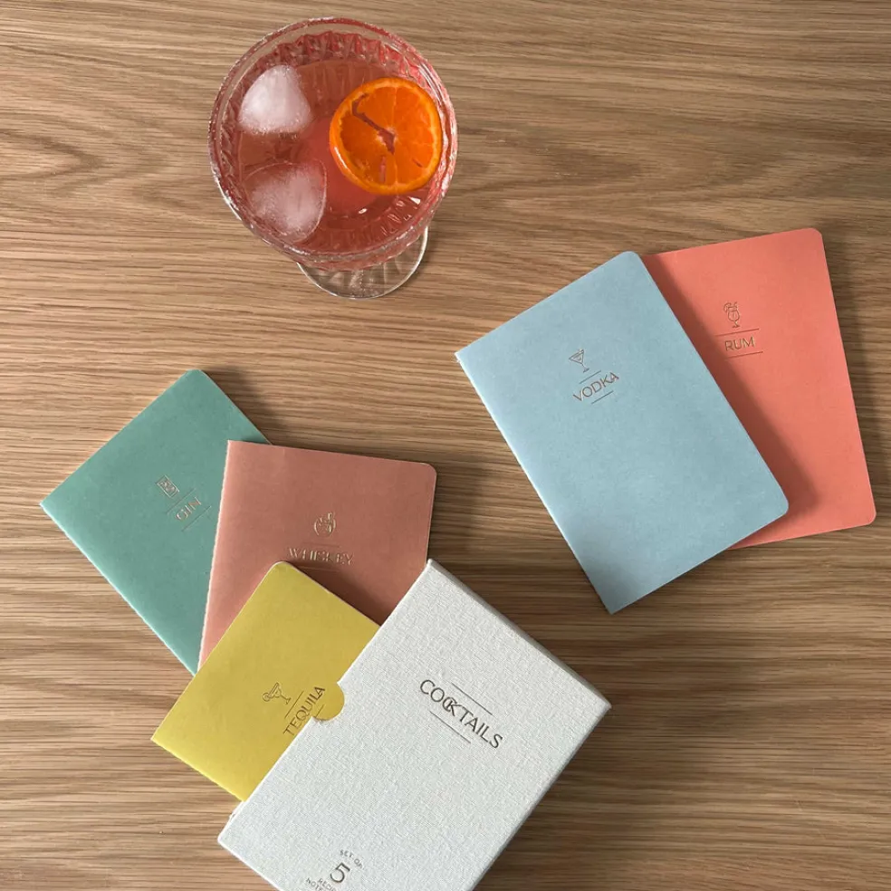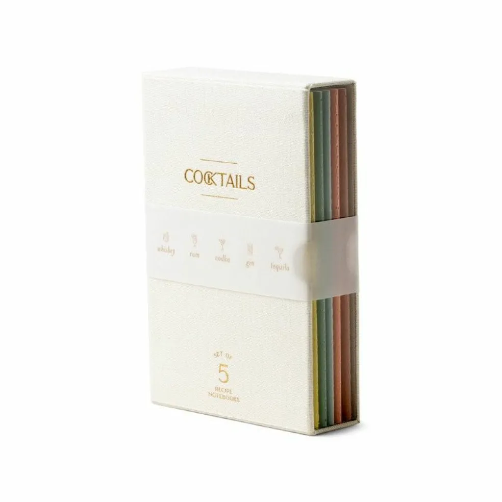 Cocktails Muistivihkosetti. Talleta lempicocktailisi! Siistissä kotelossa viiden reseptivihkon setti: vodka, gin, viski, rommi ja tequila. Vihkoissa paikka reseptin nimelle, raaka-aineille, koristeille, lasille ja valmistusohjeelle. Kuhunkin vihkoon mahtuu 15 reseptiä.