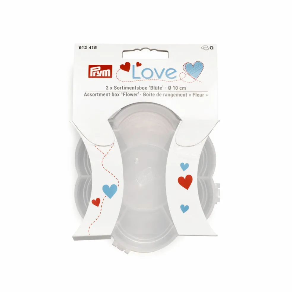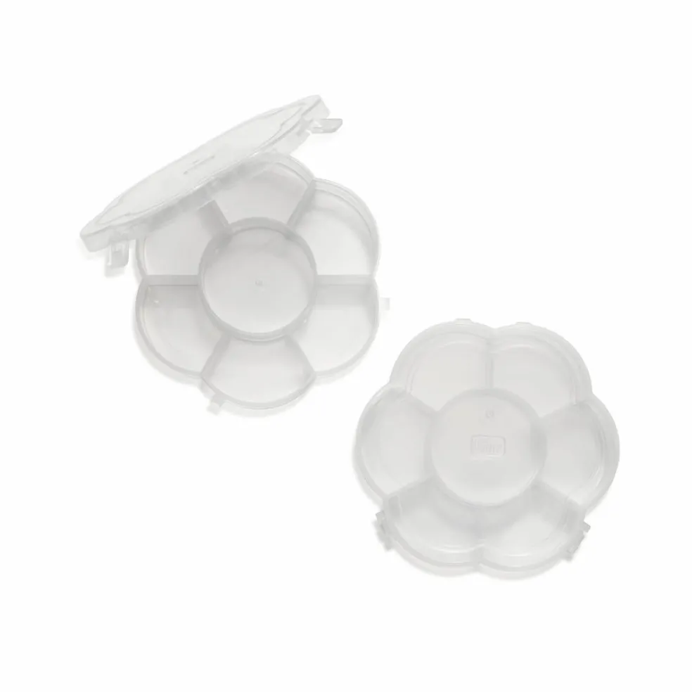 Kaikenlaisten pienten tarvikkeiden säilyttämiseen. Rasiassa 7 lokeroa helmille, nastoille, klemmareille, napeille ja neppareille. Rasian halkaisija 10 cm, kiva kukkamuoto. Pakkauksessa kaksi rasiaa.