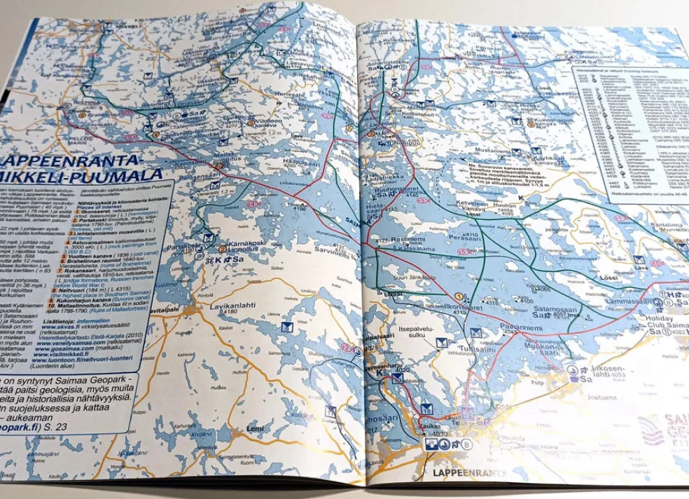 Oppaassa on runsaasti yhteystietoja, nettilinkkejä ja QR-koodeja. Tärkeimmät osuudet englanniksi. Saimaan Venematkailuopas on parhaimmillaan printtiversiona, mutta sen voi lukea myös e-lehtenä Calameo palvelussa.
