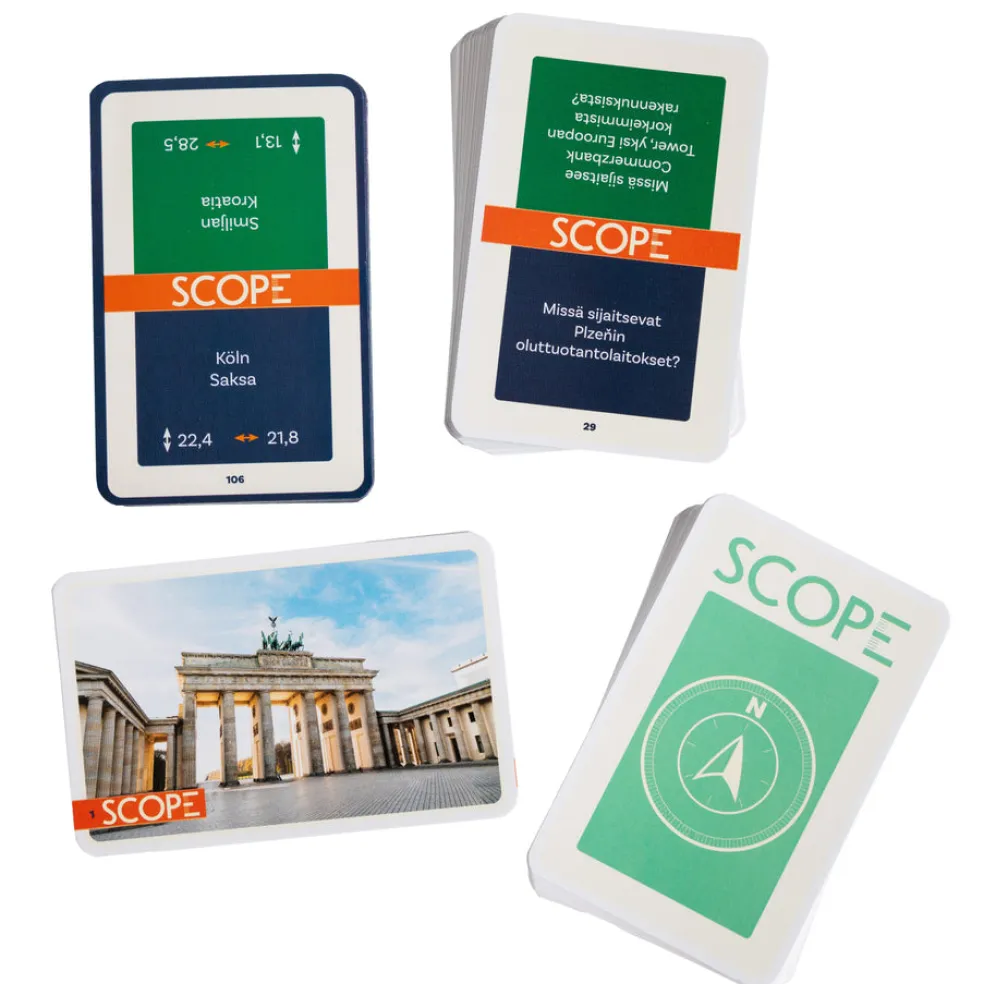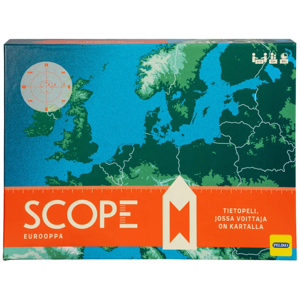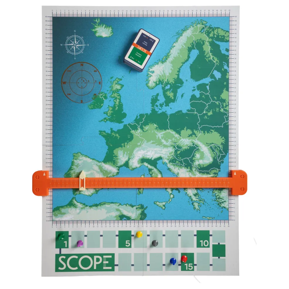 Scope on tietopeli, jossa voittaja on kartalla! Missä sijaitsee tulivuori Etna? Missä on syntynyt fyysikko Nikola Tesla? Saatat ehkä tietää, mutta tässä pelissä sinun ei tarvitse. Riittää, että arvaat tarpeeksi lähelle! Pelissä kysytään tietokilpailukysymyksiä, joiden vastaukset ovat sijainteja Euroopan kartalla. Pelaajan tehtävänä on vuorollaan arvata, missä kysymyksen oikea vastaus sijaitsee ja merkitä sijainti kartalle kohdemerkillä. Mitä lähemmäs oikeaa sijaintia hän veikkaa, sitä enemmän hän saa pisteitä. Muut pelaajat voivat myös ansaita pisteitä arvaamalla, missä ilmansuunnassa etsittävä kohde oikeasti on pelaajan vastaukseen nähden. Lopuksi oikea vastaus tarkistetaan koordinaattimittarilla. Pelin lopussa eniten pisteitä kerännyt on voittaja! Sisältää säännöt ja kortit suomeksi. 2-5 pelaajaa, 30 min, 12+
