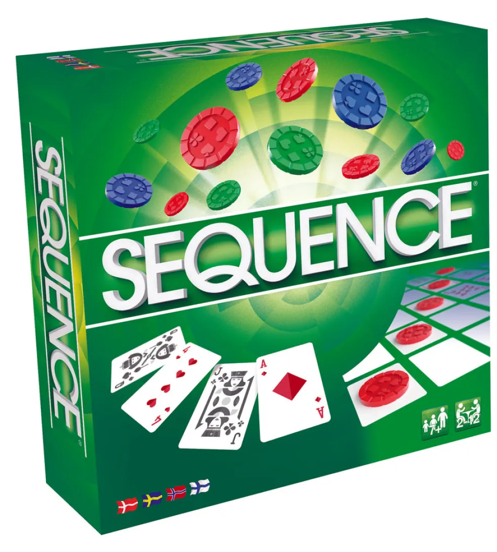 Sequence- Arvaamaton taktiikka peli 2-12 pelaajalle.Voittaaksesi ole ensimmäinen joka saa pelilaudalle jatkuvan 5 merkin rivin eli Sequencen. Asettaaksesi merkin pelaa sopiva kortti. Tarkkaile Jätkiä; toiset ovat jokereita ja toisilla saat varastaa merkin laudalta.