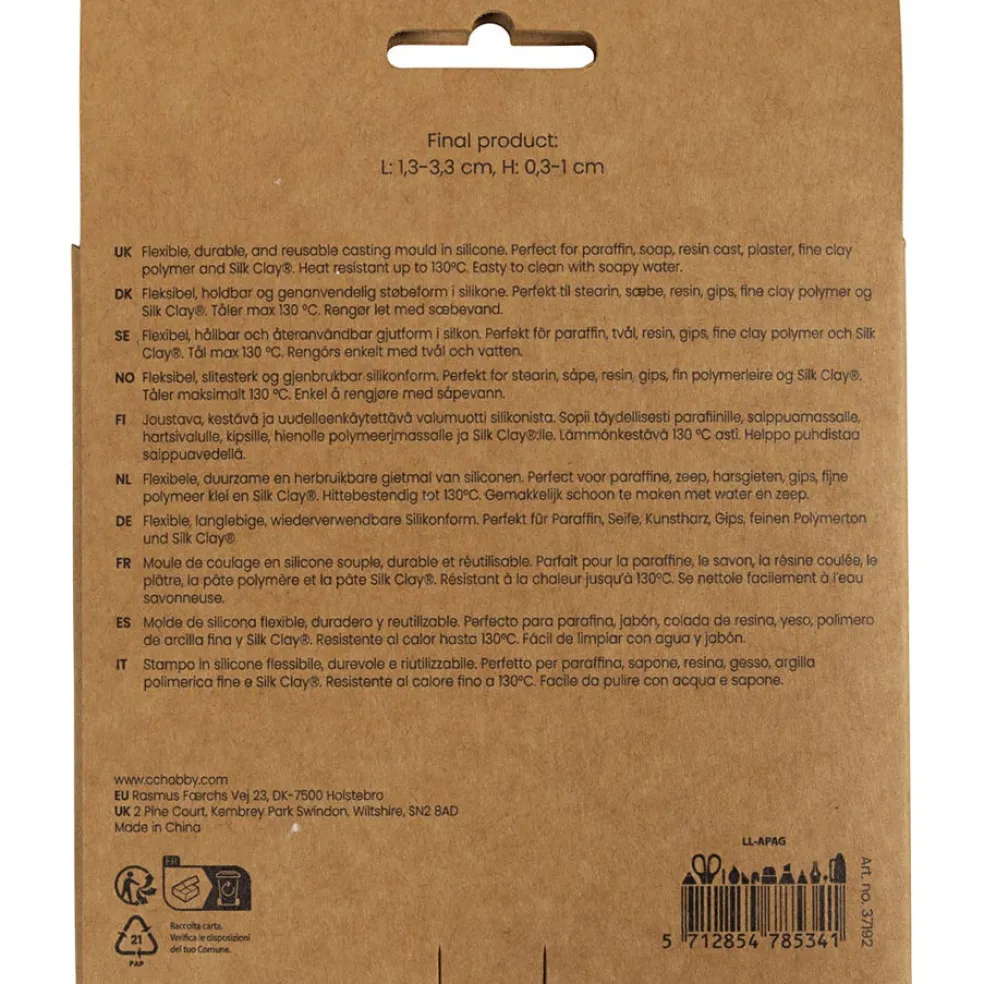 Joustavan silikonimuotin avulla voit valaa helposti upeita ja yksityiskohtaisia kuvioita. Täydellinen steariinille, saippualle, hartsille, kipsille, korumassalle ja Silk Clay® -massalle. Uuninkestävä 130 asteeseen.. Muotti on valmistettu kestävästä silikonista – joustavan materiaalin ansiosta luomuksesi on helppo irrottaa muotista yksityiskohdat säilyttäen. Korkeus 0,3-1 cm, pituus 1,3-3,3 cm.