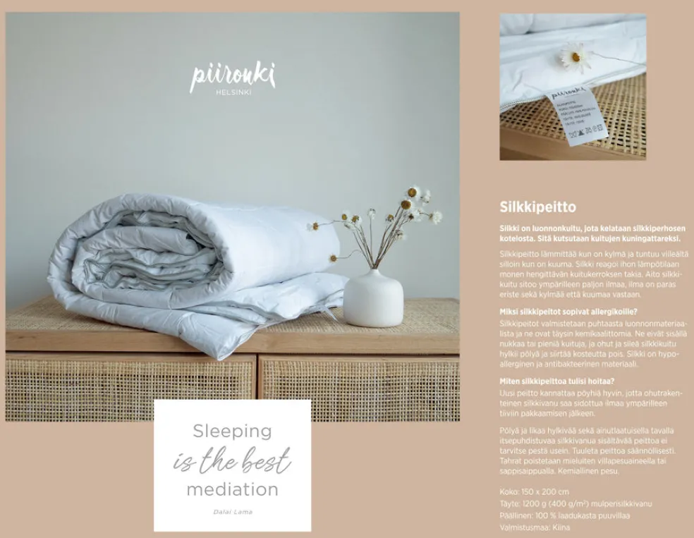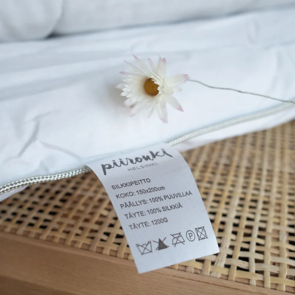 Silkkipeitto lämmittää silloin kun on kylmä ja tuntuu viileältä silloin kun on kuuma. Hengittävä silkki ja puuvillapäällinen takaavat hyvän lämmönsäätelyn ja kosteudensitomisen. Silkki on luontaisesti allergiaturvallinen materiaali, joka hylkii likaa eikä anna bakteereille kasvualustaa. Silkkipeiton hoito-ohje: peitto kannattaa tuulettaa säännöllisesti. Tahrat poistetaan paikallisesti villapesuaineella tai sappisaippualla, mutta silkkitäytettä ei tule kastella. Jos peitto vaatii pesua, vie se pesulaan.
