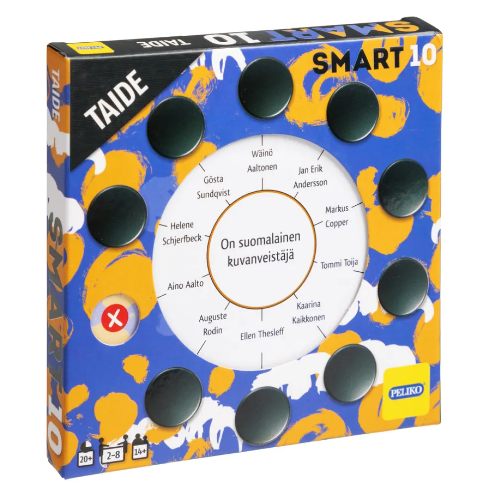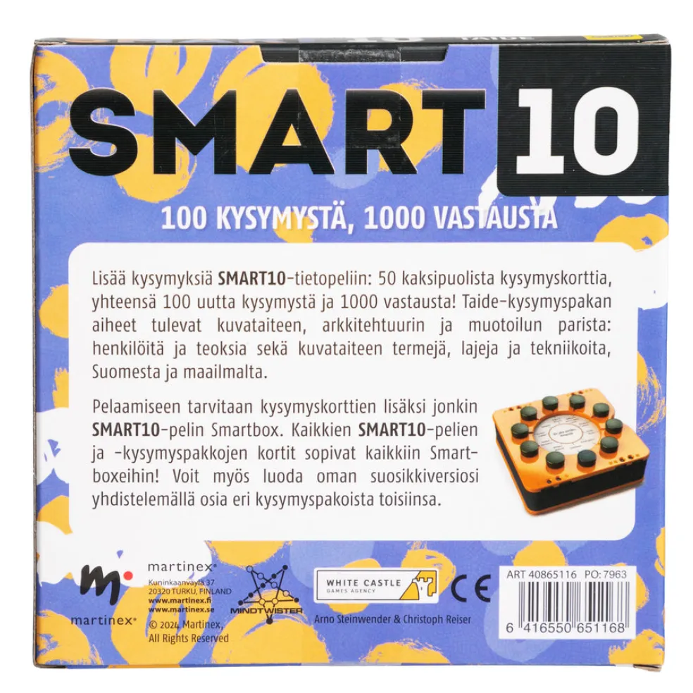 Lisää kysymyksiä SMART10-tietopeliin: 50 kaksipuolista kysymyskorttia, yhteensä 100 uutta kysymystä ja 1000 vastausta! Kysymyspakan aiheet tulevat kuvataiteen, arkkitehtuurin ja muotoilun parista, ja koskevat tunnettuja henkilöitä ja teoksia sekä kuvataiteen termejä, lajeja ja tekniikoita. Vaihda Smartboxissa olevat kysymykset kahteen teemapakkaan tai sekoita Taide-teemapakka puolikkaaseen alkuperäistä kysymyspakkaa. Pelaamiseen tarvitaan kysymyskorttien lisäksi SMART10-, SMART10 JR tai SMART10 Harry Potter -pelin Smartbox. Kaikkien Smart10-pelien ja kysymyspakkojen kortit sopivat kaikkiin Smart10 Smartboxeihin! 2-8 pelaajaa, 20 min, 14+