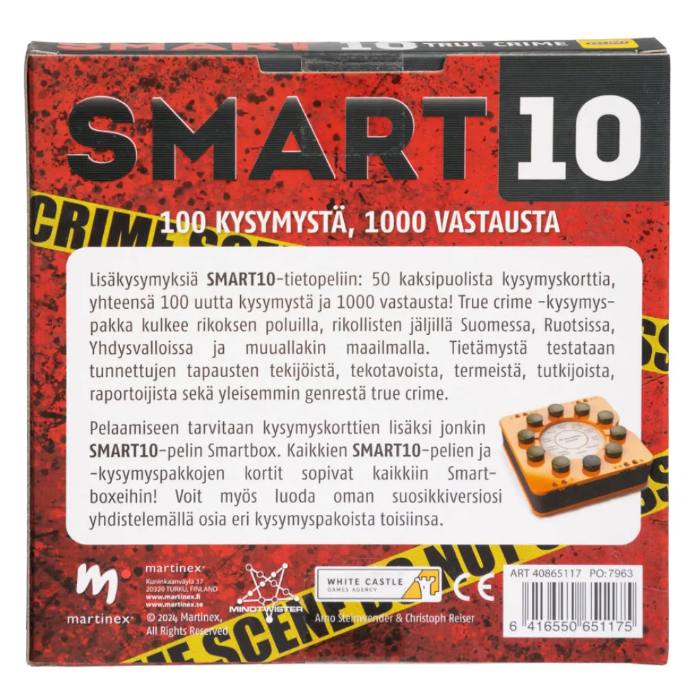 Lisää kysymyksiä SMART10-tietopeliin. Pakkaus sisältää 50 kaksipuolista kysymyskorttia, yhteensä 100 uutta kysymystä ja 1000 uutta vastausta. Kysymyskorttien lisäksi pelaamiseen tarvitaan SMART10- tai SMART10 JR -pelin Smartbox. Vaihda Smartboxissa olevat kysymyskortit kahteen teemapakkaan tai sekoita teemapakka puolikkaaseen alkuperäistä kysymyspakkaa. Kaikkien Smart10-pelien ja kysymyspakkojen kortit sopivat kaikkiin Smart10 Smartboxeihin! 2-8 pelaajaa, 20 min, 14+