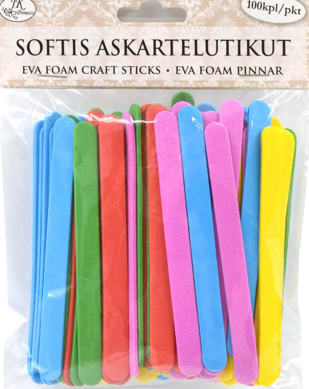 Softistikut askarteluun ja koristeluun. Pakkaus sisältää 100 kappaletta vaahtomuovisia askartelutikkuja viidessä eri värissä. Yhden tikun koko on n. 11,5cm x 1cm.