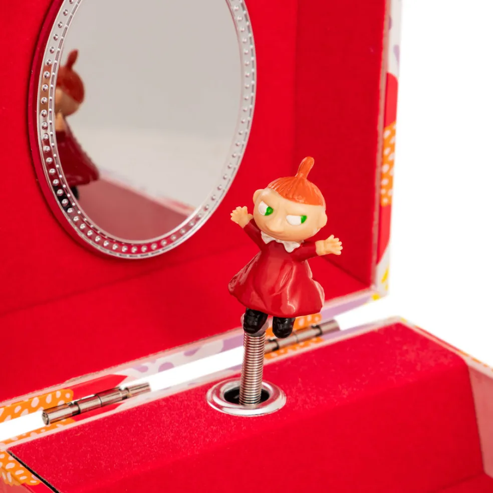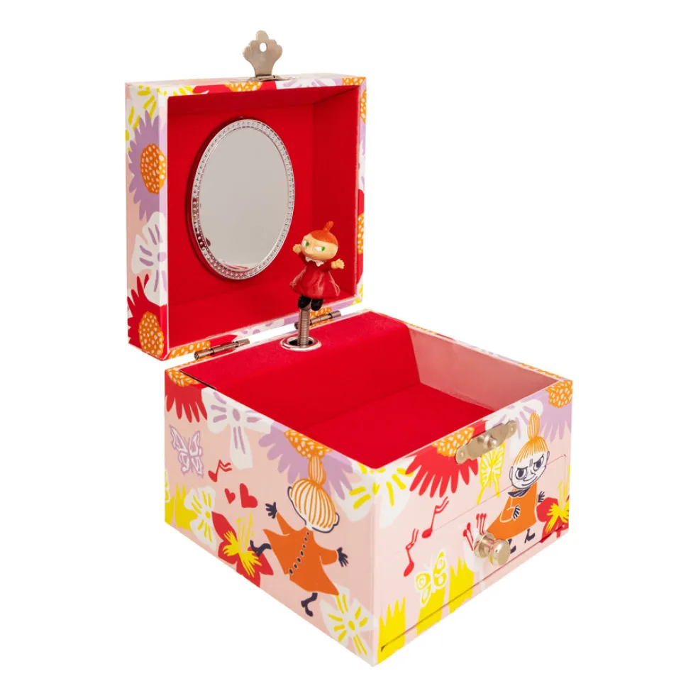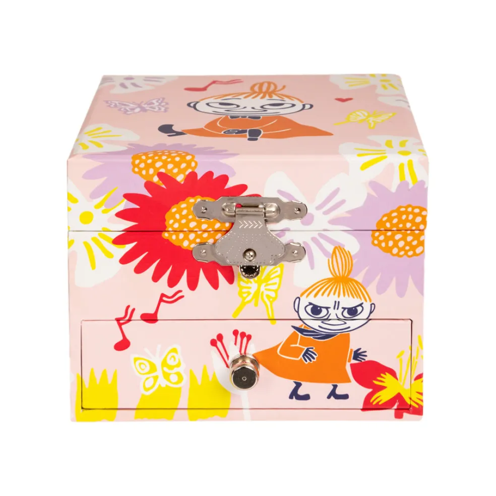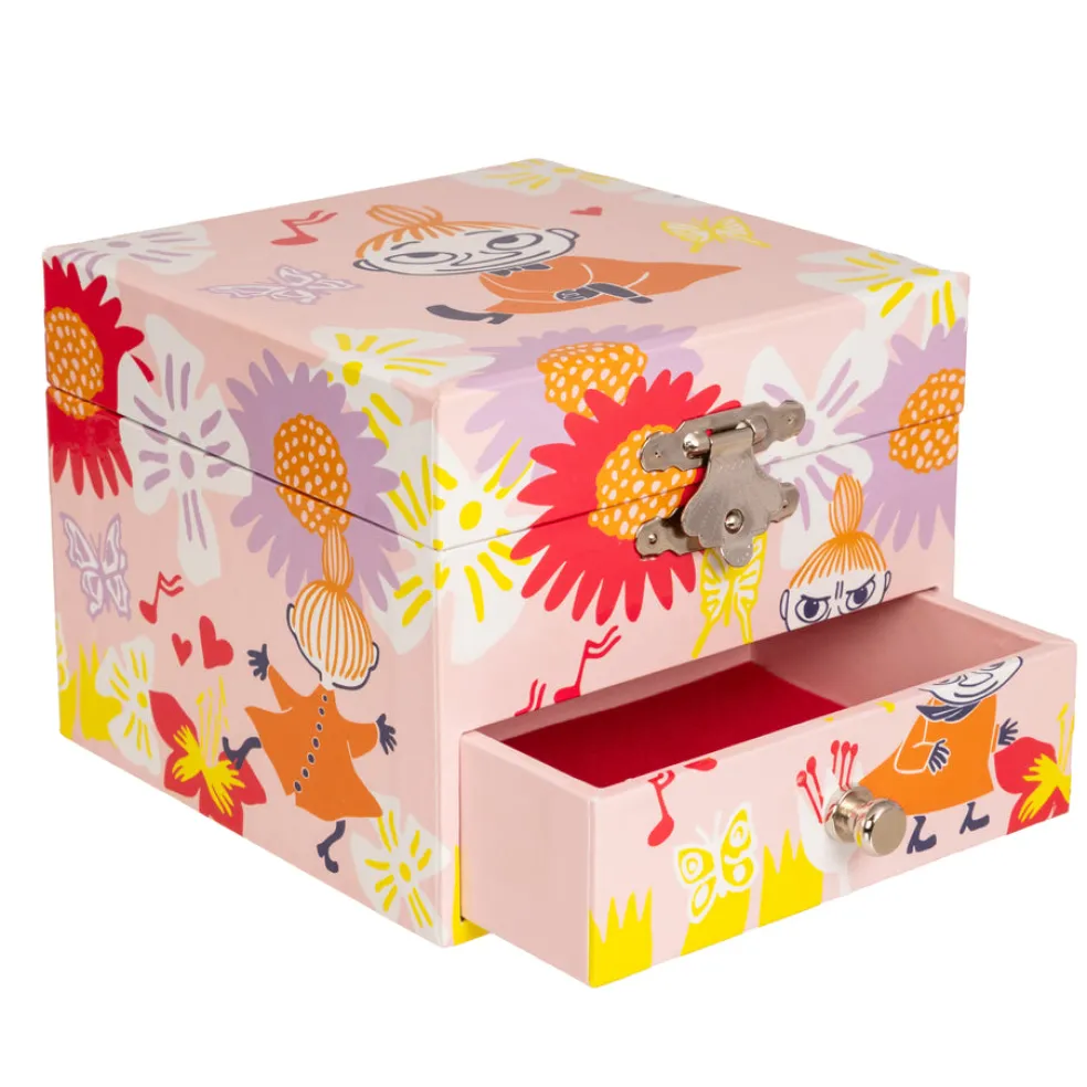 Soiva pinkki korurasia, koristeltu Pikku Myyn ja perhosten kuvilla. Edessä aukeava korulaatikko.