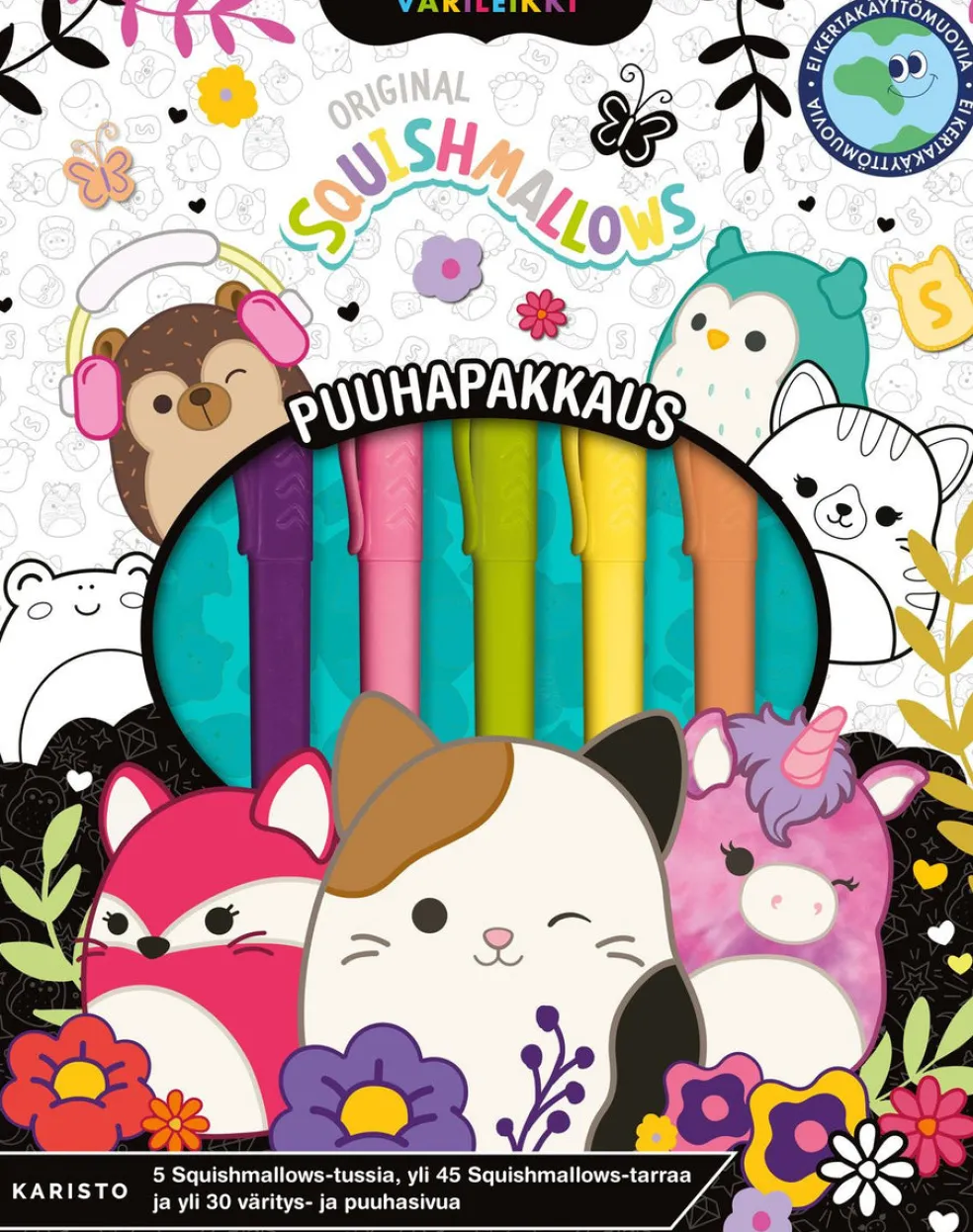 Puuhapakkaus sisältää 5 tussia, yli 30 väritys- ja puuhasivua ja yli 45 ihastuttavaa Squishmallows tarraa.