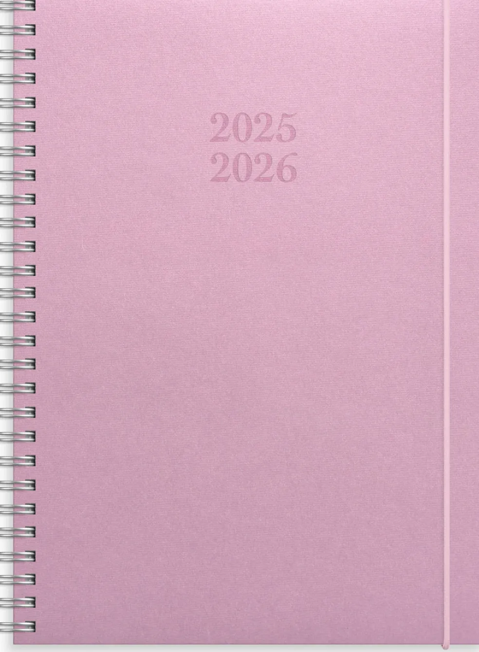 Päällystetty kartonkikansi, jossa on hieman kiiltoa materiaalissa. Kuminauhalla. Kalenterin aukeamalla yksi viikko, tuntijaotus 08-20, palsta muistiinpanoille, kuluvan ja seuraavan kuukauden kalenteritaulukot. Kalenteri sisältää nimipäivät, juhlapyhät, liputuspäivät, kuun vaiheet, vuosisuunnitelmat ajalle heinäkuu 2025 – heinäkuu 2027, tietosivut, lukujärjestykset ja muistiinpanosivut. Kalenteriosa: vk 29 2025 – vk 30 2026. Kolmikielinen: suomi/ruotsi/englanti. Parikierresidottu. FSC®.