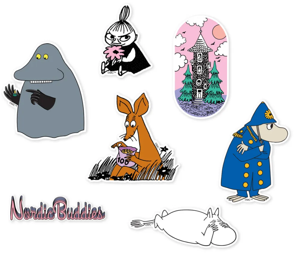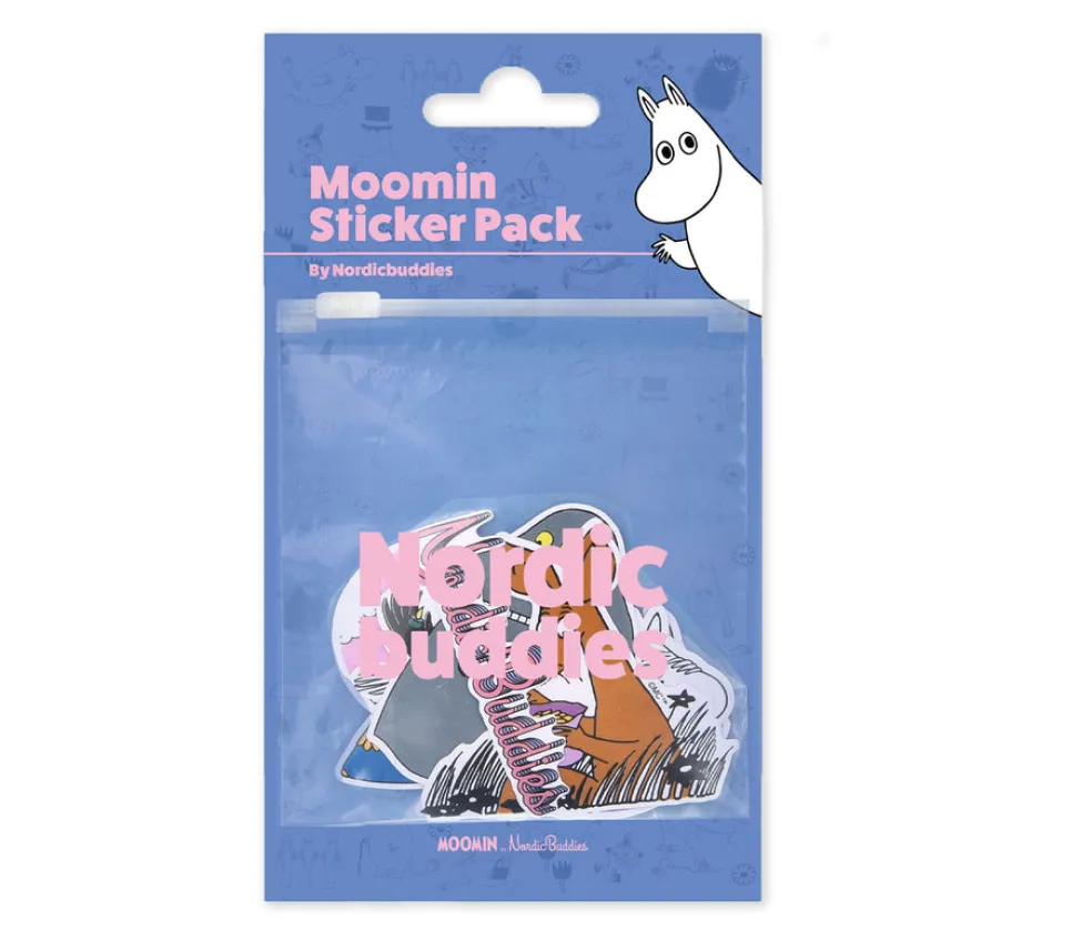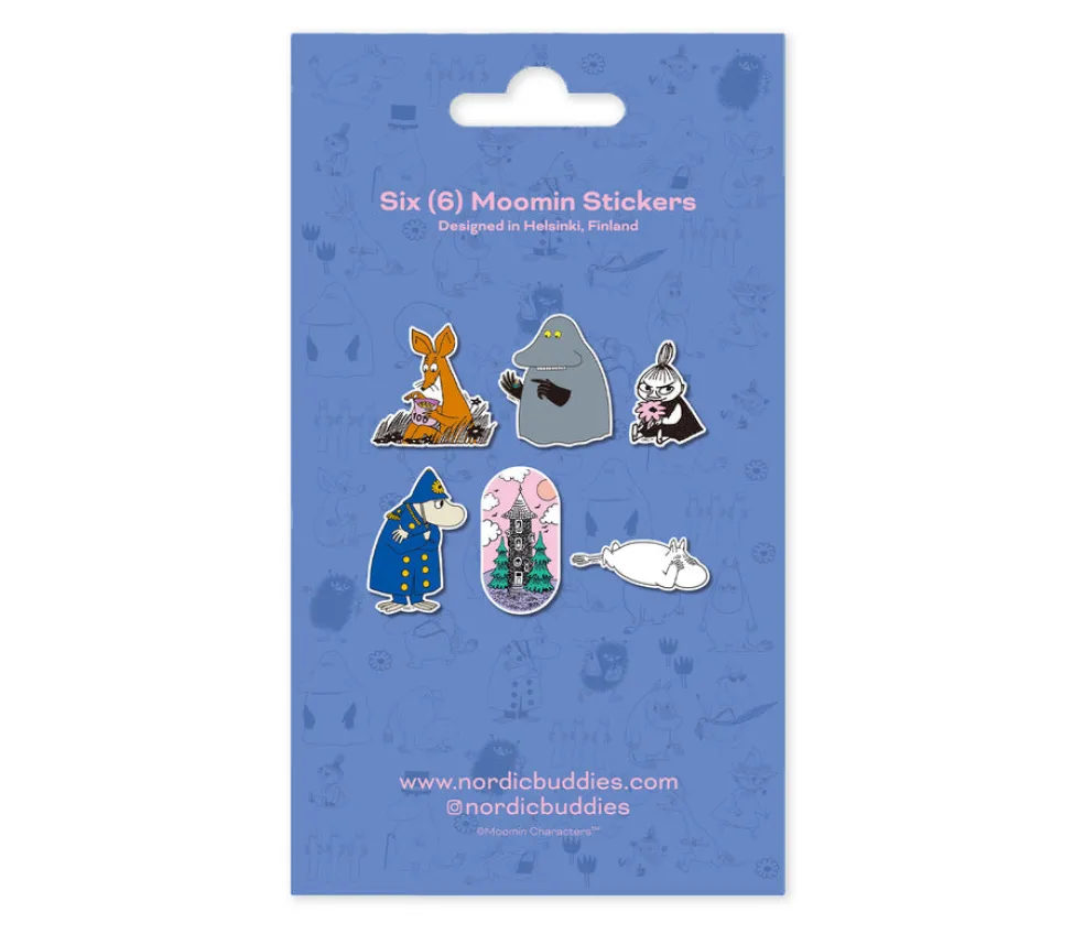 Pakkaus sisältää 6 tarraa. Pakkauksen koko 8 x 14cm. Pakkauksessa hahmot: Muumipeikko, Nipsu, Mörkö, Muumitalo, Pikku Myy ja Hemuli