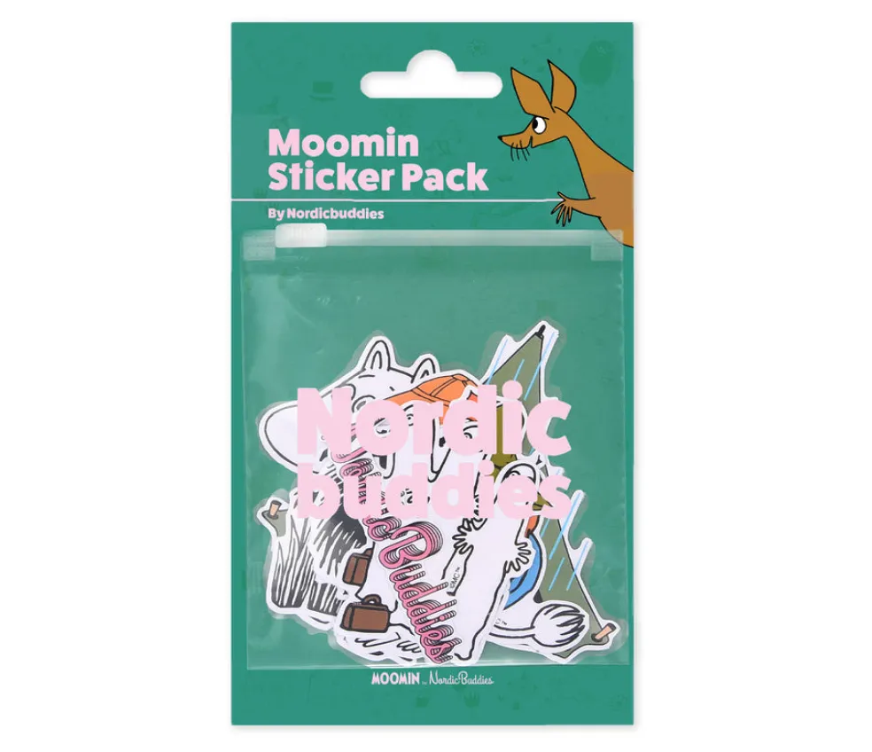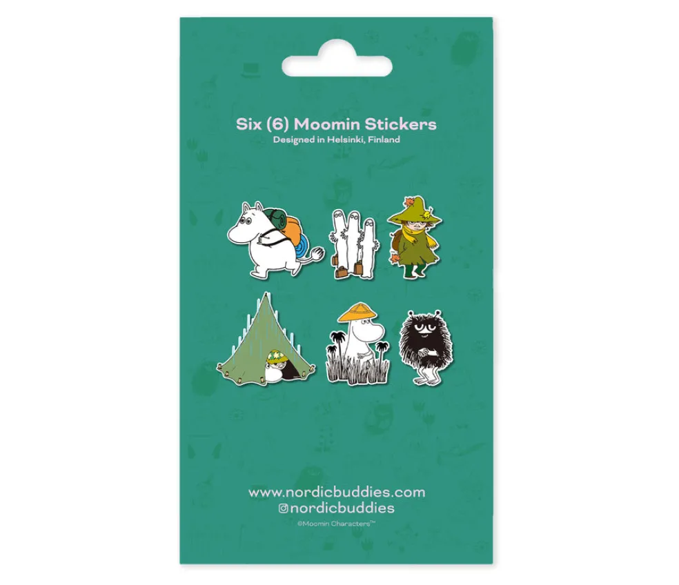 Pakkaus sisältää 6 tarraa. Pakkauksen koko 8 x 14cm. Pakkauksessa hahmot: Muumipeikko, Nuuskamuikkunen, Haisuli ja Hattivatit