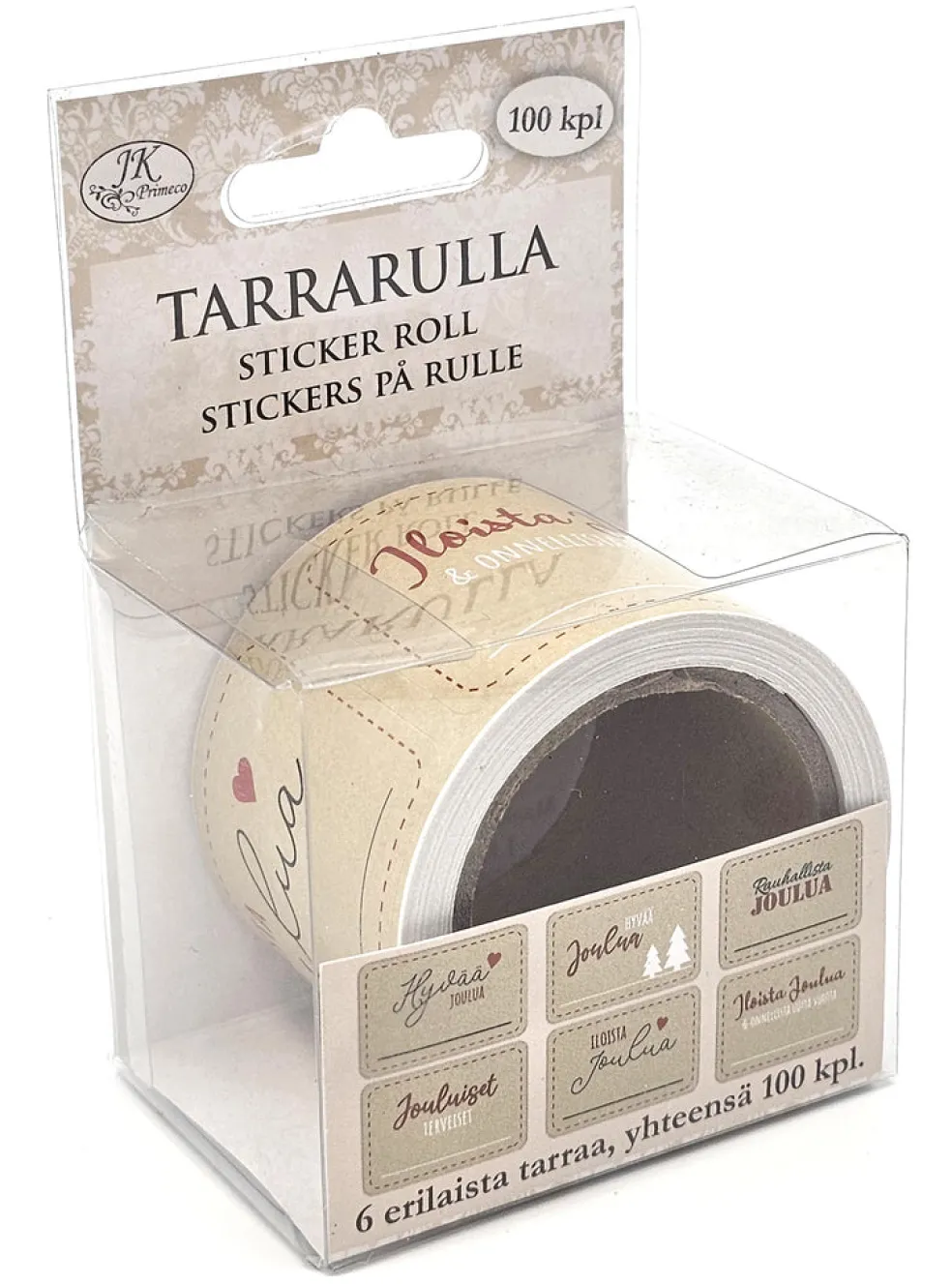 Tarrarulla askarteluun, paketointiin ja koristeluun. Pakkaus sisältää kuusi erilaista tarraa, yhteensä 100 kappaletta. Yhden tarran koko on n. 6cm x 4cm.