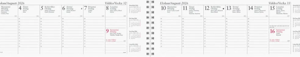 Kartonkiset kannet. Kalenterin aukeamalla kaksi viikkoa, tuntijaotus 08-18 ja menneen, kuluvan sekä kahden seuraavan kuukauden kalenteritaulukot. Kalenteri sisältää nimipäivät, kansalliset pyhät, liputuspäivät, kuun vaiheet, vuosisuunnitelmat kuluvalle ja seuraavalle vuodelle, vuosiruudukot edelliselle ja kolmelle seuraavalle vuodelle ja yleiset pyhäpäivät Euroopassa. Kalenteriosa: vk 52 2025-vk 53 2026/2027. Kaksikielinen suomi/ruotsi. Parikierresidottu. FSC®. Koko: 255×95 mm.