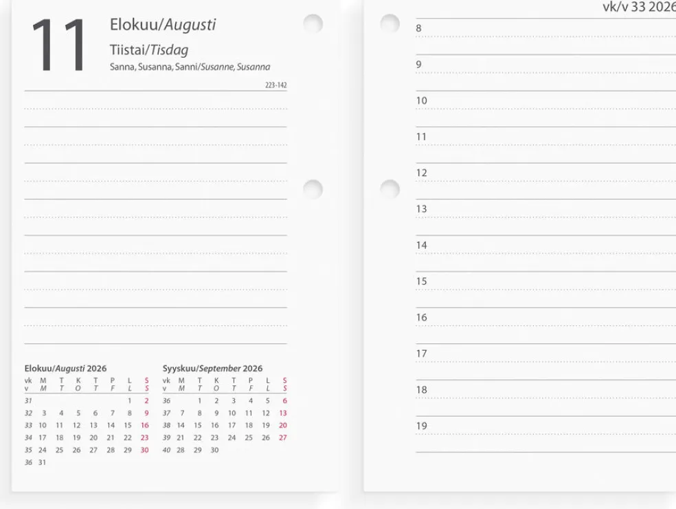 Pieni ja kätevä pöytäkalenteri toimistokäyttöön. Kalenterin aukeamalla yksi päivä, tuntijaotus 08-19 ja kuluvan sekä seuraavan kuukauden kalenteritaulukko. Kalenteri sisältää nimipäivät, kansalliset pyhäpäivät, liputuspäivät, kuun vaiheet, vuosiruudukot kuluvalle ja seuraavalle vuodelle. Kalenteriosa: 29.12.2025 – 03.01.2027. Kaksikielinen: suomi/ruotsi. FSC®. Koko: 75×115 mm.