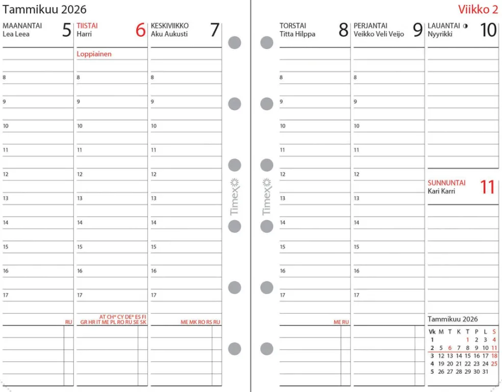 Koko 82 x 128 mm; aukeamalla pystyviikko; päiväkirja 52/2025–1/2027; vuosisuunnitelmat 2026 ja 2027; luettelona suomalaiset ja suomenruotsalaiset nimipäivät; kansalliset vapaapäivät; liputuspäivät Suomessa; vuosiruudukko; FSC®-sertifioitu tuote.