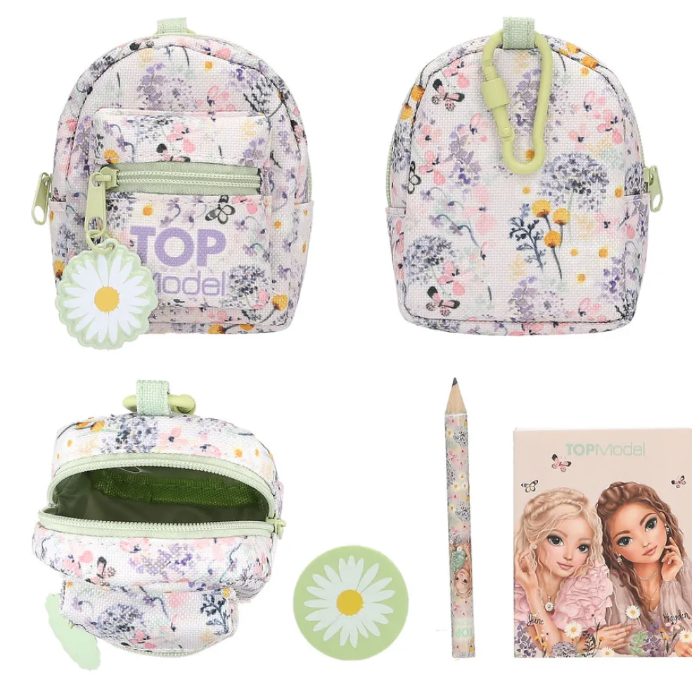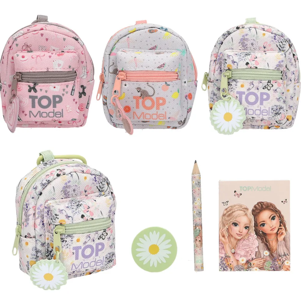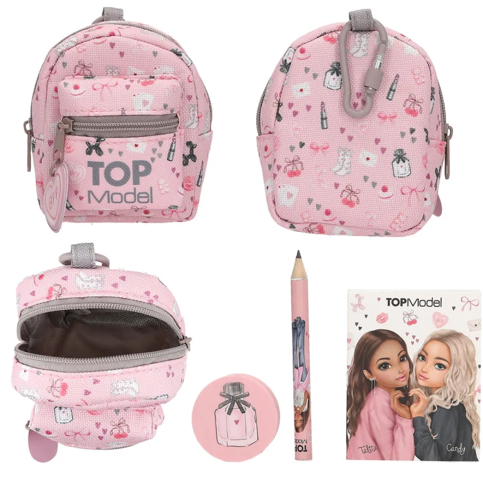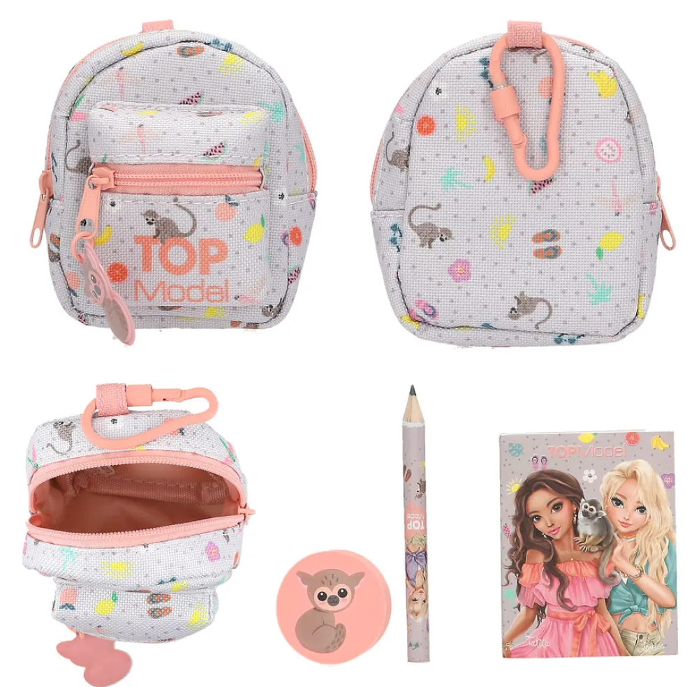 Suloinen minireppu kirjoitustarvikkeilla. Vetoketjulla sulkeutuvan repun sisältä löydät lyijykynän, pyöreän pyyhekumin ja pienen muistivihkon, jotka sopivat yhteen repun kuvituksen kanssa. Tämä on hauska tapa pitää muistiinpanovälineet aina mukana, sillä repussa on karbiinihaka, jolla sen saa kätevästi kiinnitettyä esim. laukkuun tai reppuun. Saatavilla kolme erilaista mallia.