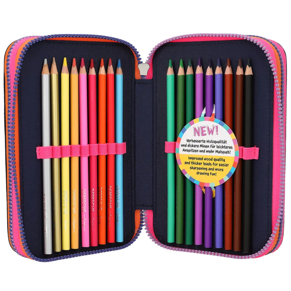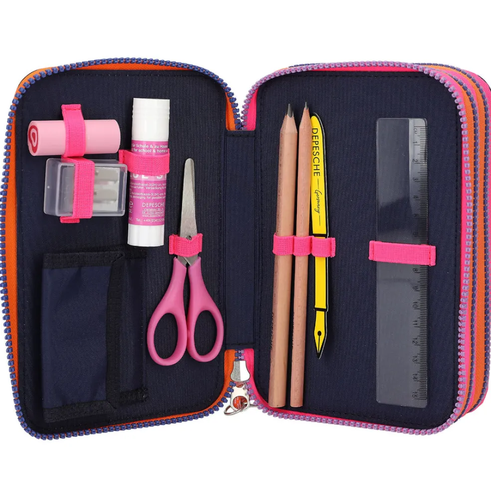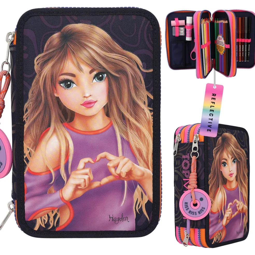 TOPModel NIGHT LIGHT -penaalin kolme vetoketjuin suljettavaa kerrosta sulkee sisälleen kaiken mitä piirtämiseen ja kirjoittamiseen tarvitset: puuvärikynät ja tussit, 18 kappaletta kutakin, 2 lyijykynää, viivoittimen, sakset, liiman, pyyhekumin ja teroittimen! Penaalin hymiökuviot on valmistettu heijastavasta materiaalista. Materiaali 100 % polyesteri.
