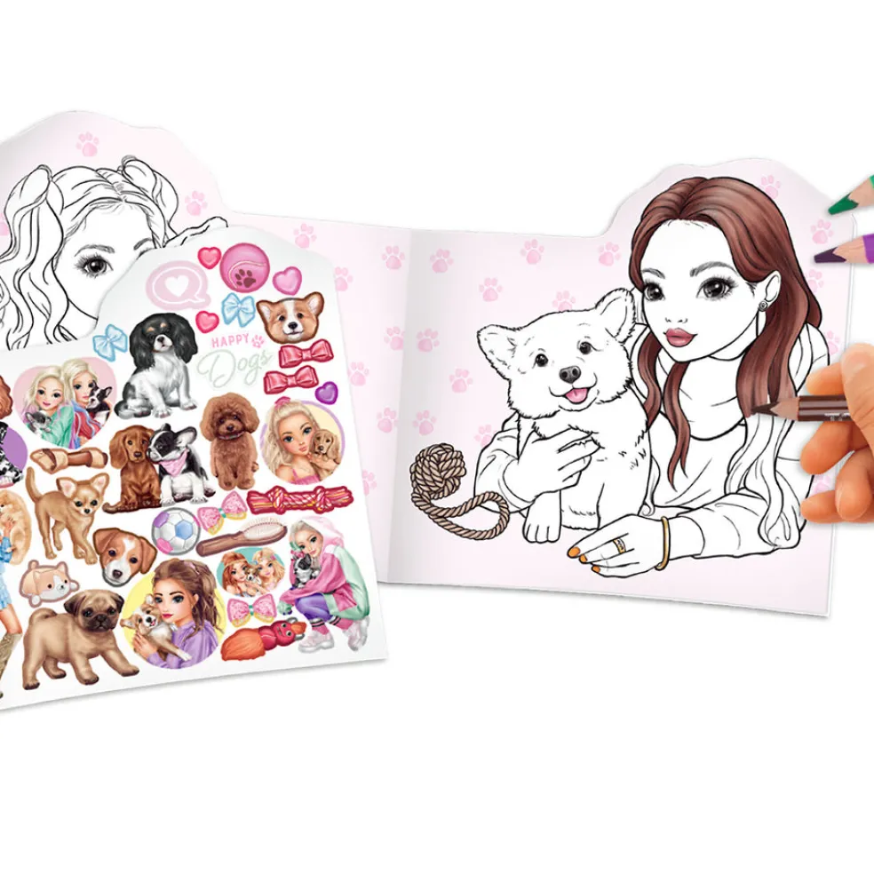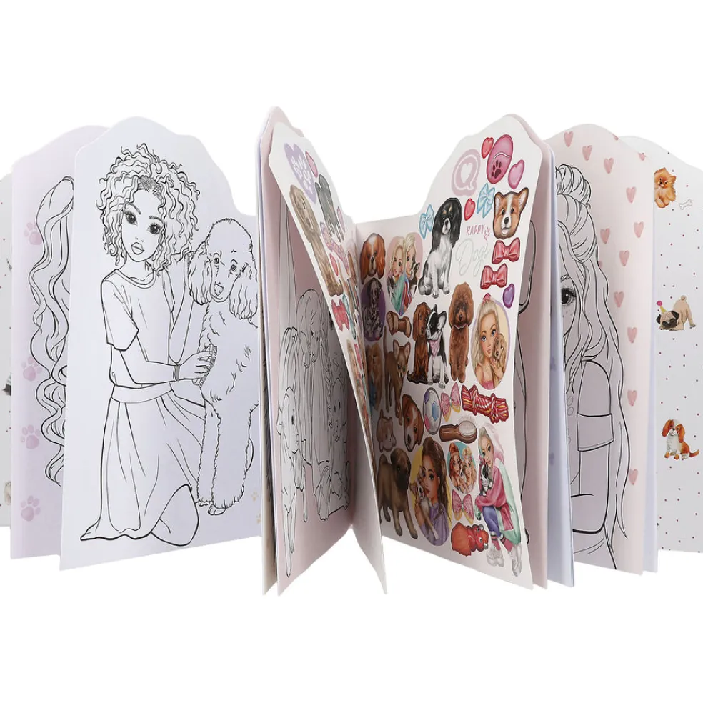 TOPModel värityskirjassa on 21 sivua täynnä suloisia koira-aiheisia värityskuvia. Vielä erityisemmän kirjasta tekee muotoon leikattu malli ja tuplasivullinen tarroja.