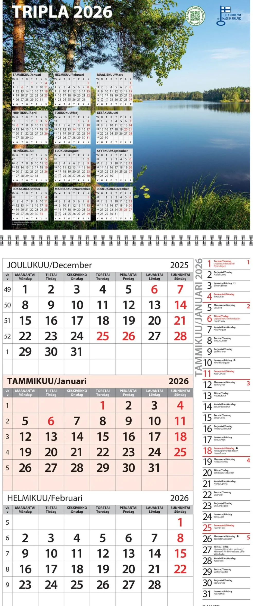 Koko 290 x 415 mm, avattuna 290 x 695 mm; parikierresidottu; kielisyys: suomi, ruotsi; suomalaiset ja suomenruotsalaiset nimipäivät; kannessa värikuva ja koko vuoden taulukkokalenteri; taustapahvissa värillinen Suomen kartta; Avainlippu-tuote; FSC®-sertifioitu tuote; 100 % hiilineutraali tuote.