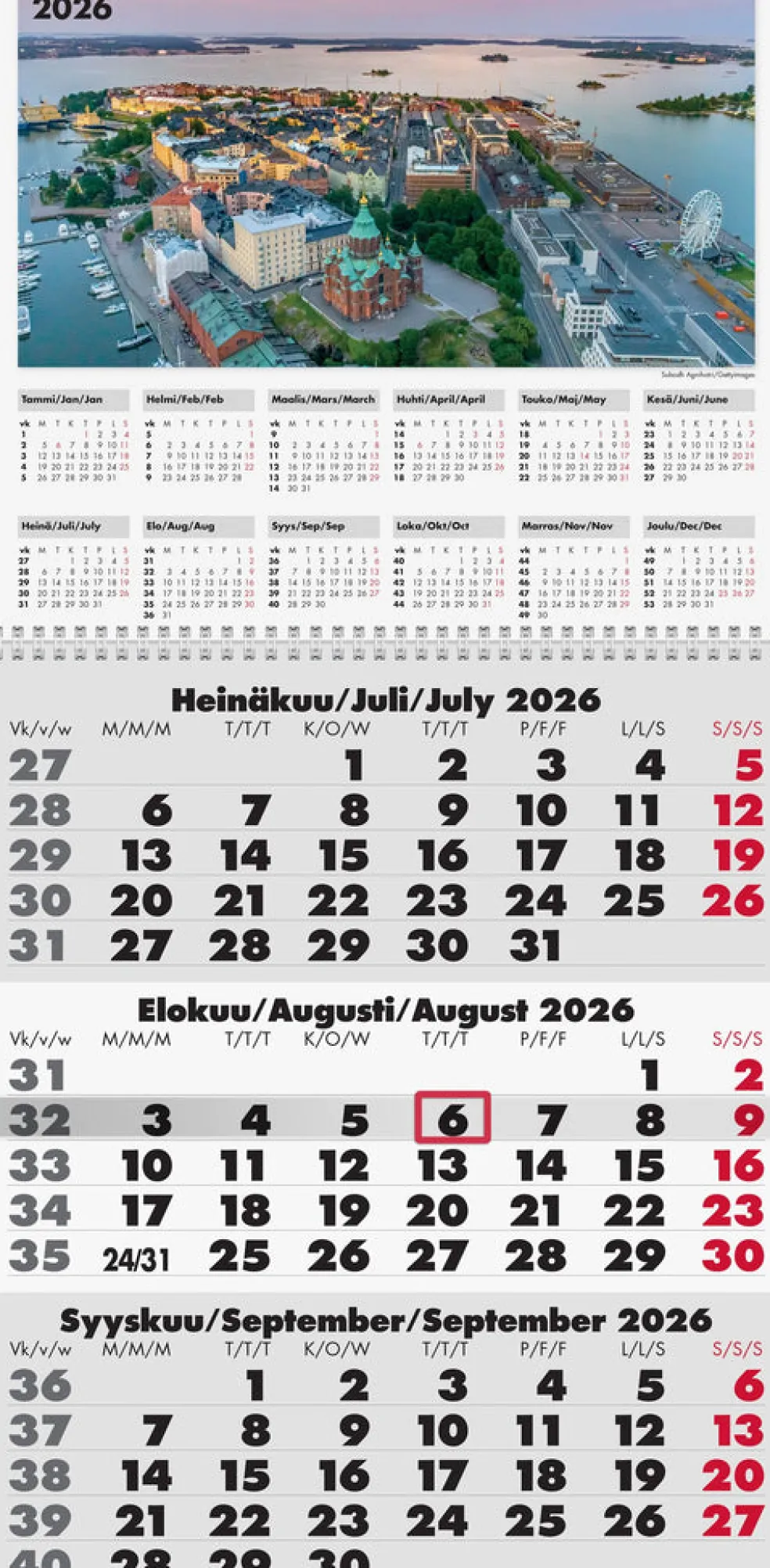 12 sivua: kolmen kuukauden kalendaario aina näkyvissä, jossa kuluva kuukausi löytyy keskeltä. Yläreunassa koko vuoden kuukausitaulukot. Ripustinreikä ja siirrettävä päiväosoitin. Kolmikielinen kalenteriosa: suomi/ruotsi/englanti. Parikierresidottu. FSC®. Koko: 285×615 mm.