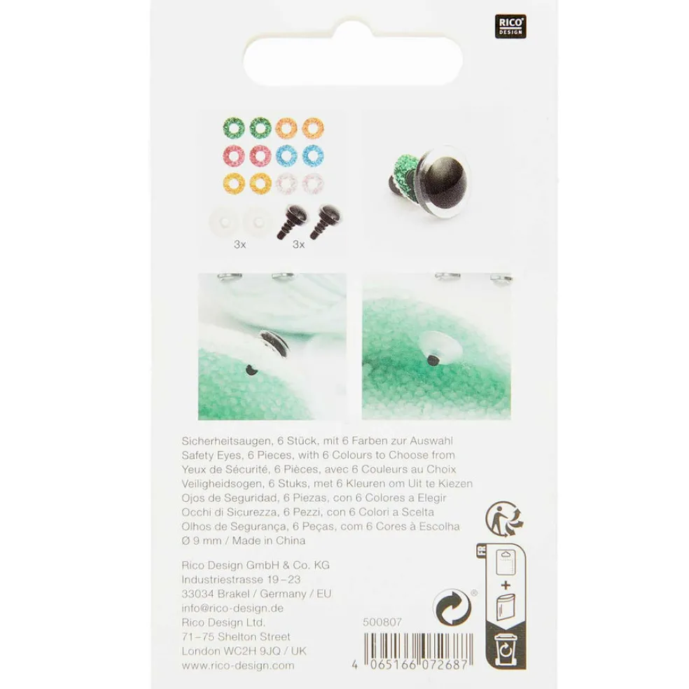 Rico Designin turvasilmät ovat oivallisia kaikkiin käsitöihin ja askarteluihin, erityisesti pehmolelujen valmistukseen. Näiden 9 mm kokoisten silmien kiinnitys on erittäin pitävä, joten voit olla varma, että ne pysyvät paikoillaan. Pakkauksessa on kuusi kappaletta, eli kolme paria turvasilmiä, joissa on musta keskusta ja värillinen kehä. Voit valita kehän värin kuudesta eri vaihtoehdosta, mikä antaa sinulle mahdollisuuden luoda juuri haluamasi ilmeen.