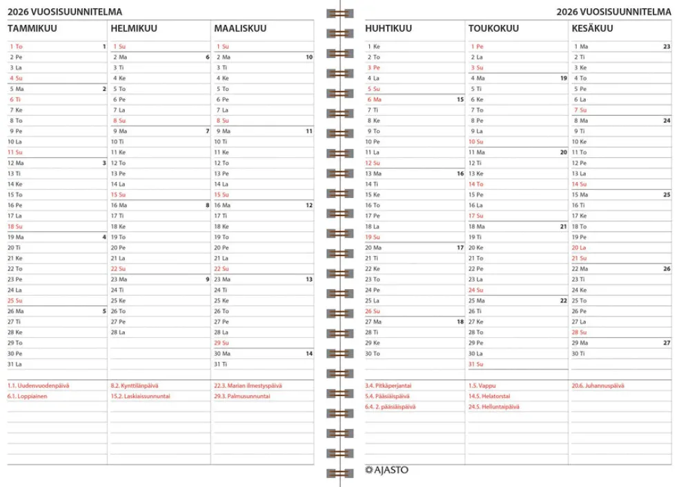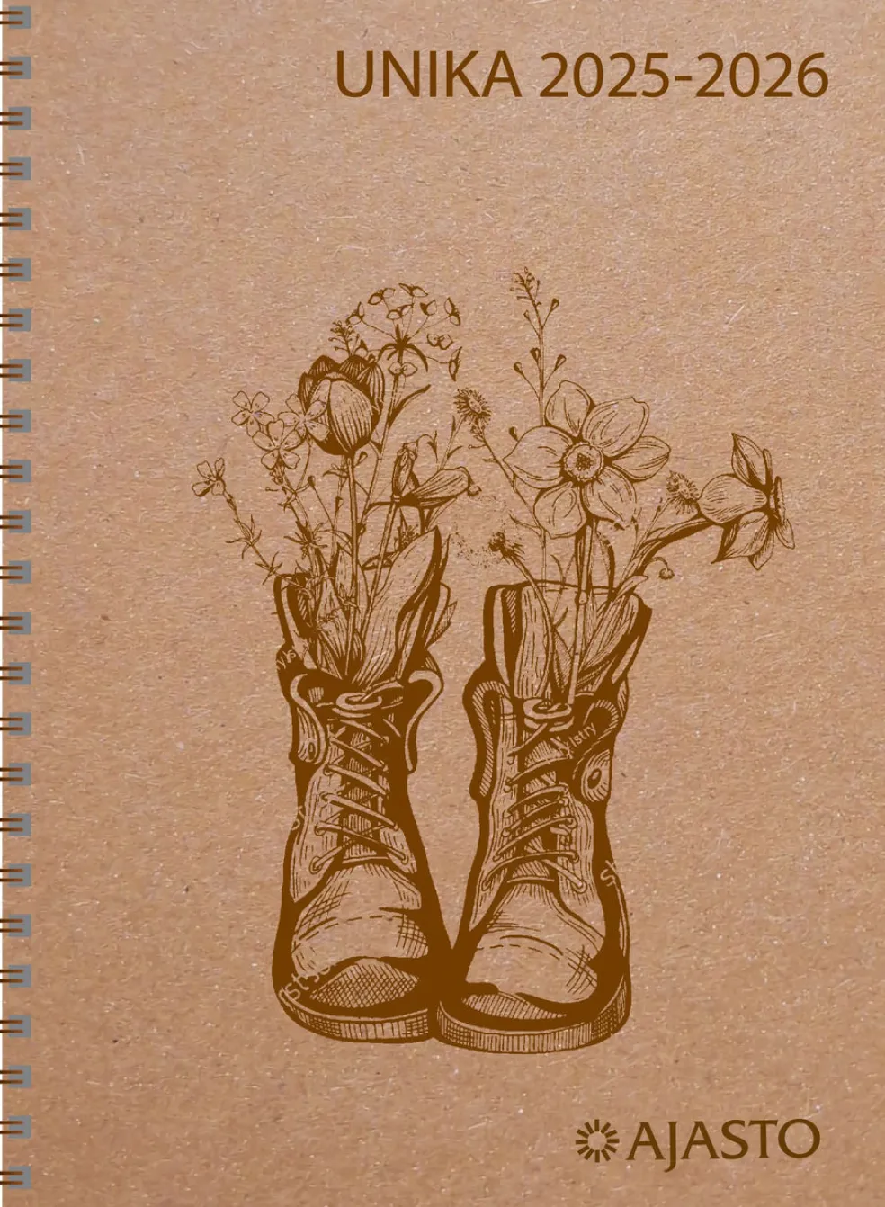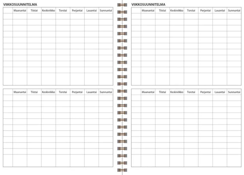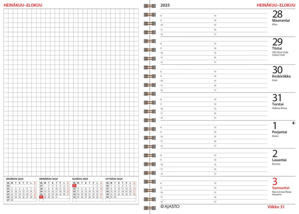 Koko 148 x 210 mm, parikierresidottu, tukevat kartonkikannet, aukeamalla selkeä viikkonäkymä, päiväkirja 30/2025-32/2026, vuosisuunnitelmat 7/2025-12/2026, viikkosuunnitelmasivuja, vuosiruudukko, liputuspäivät Suomessa, suomalaiset nimipäivät, tärkeitä kalenteripäivämääriä 2025-2030, ulkomaanpuheluopas, runsaasti kuukausikohtaista muistiinpanotilaa.